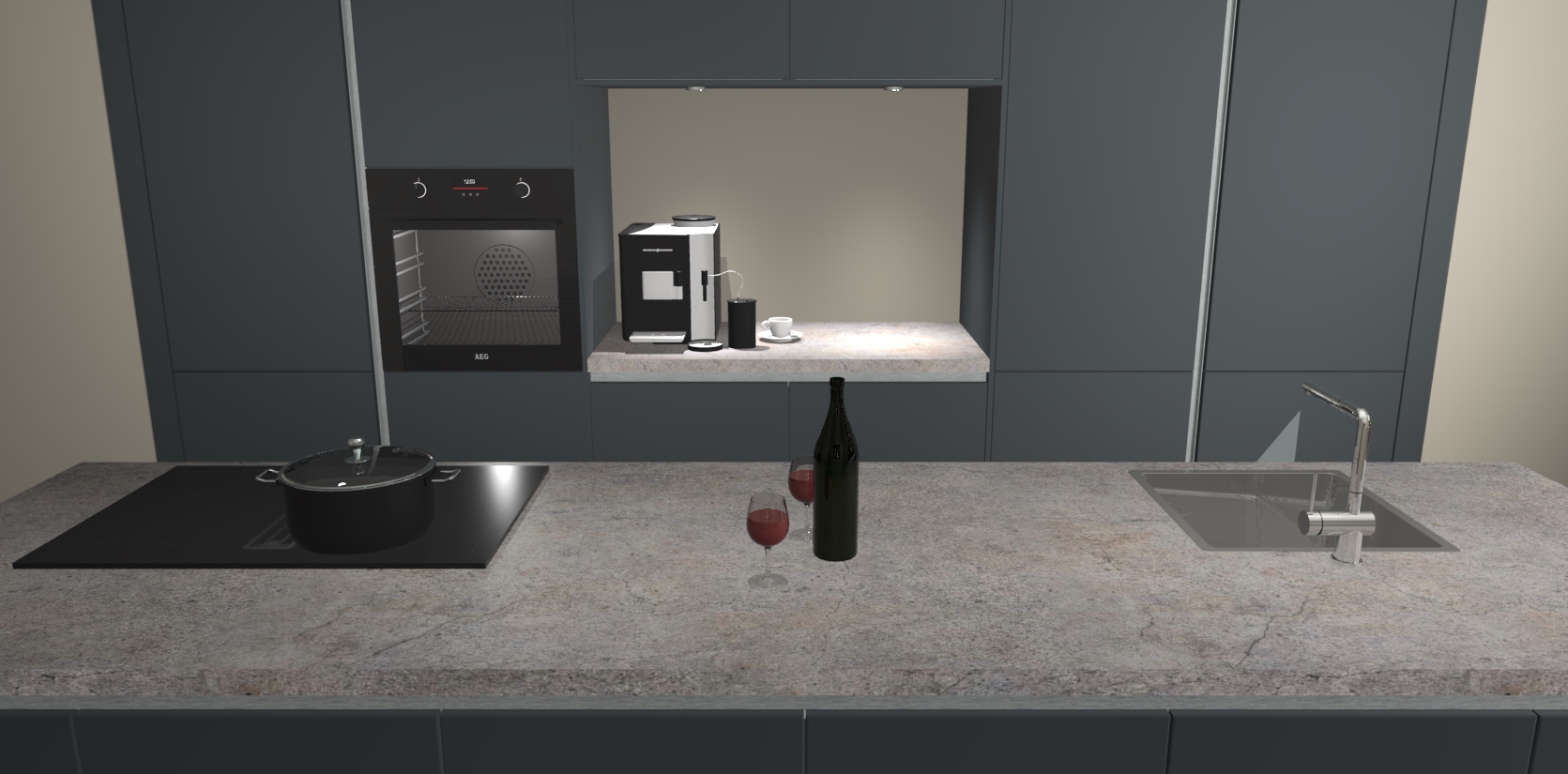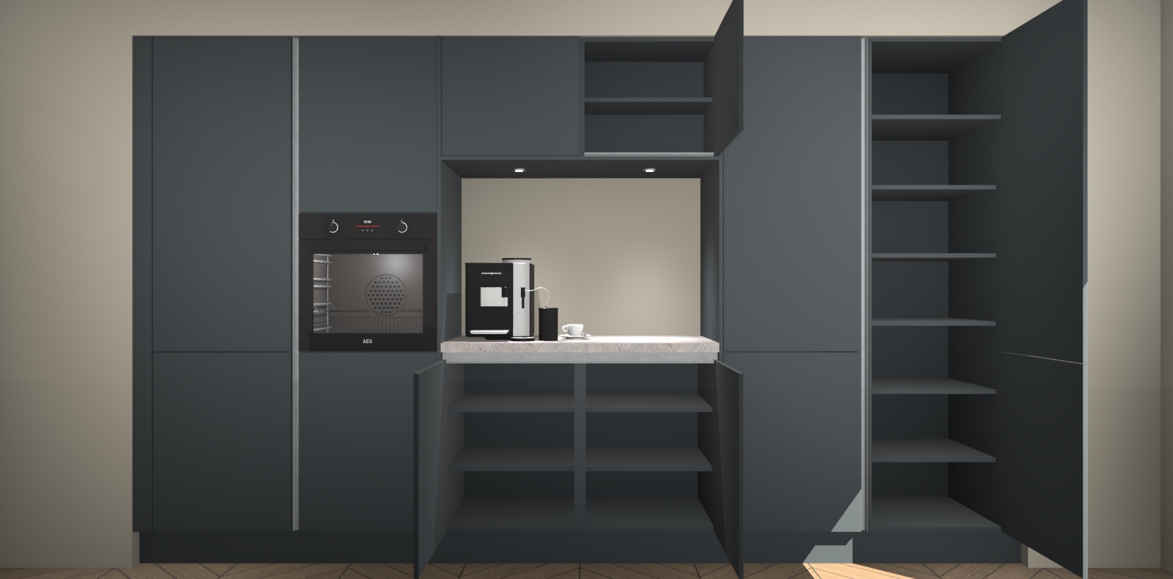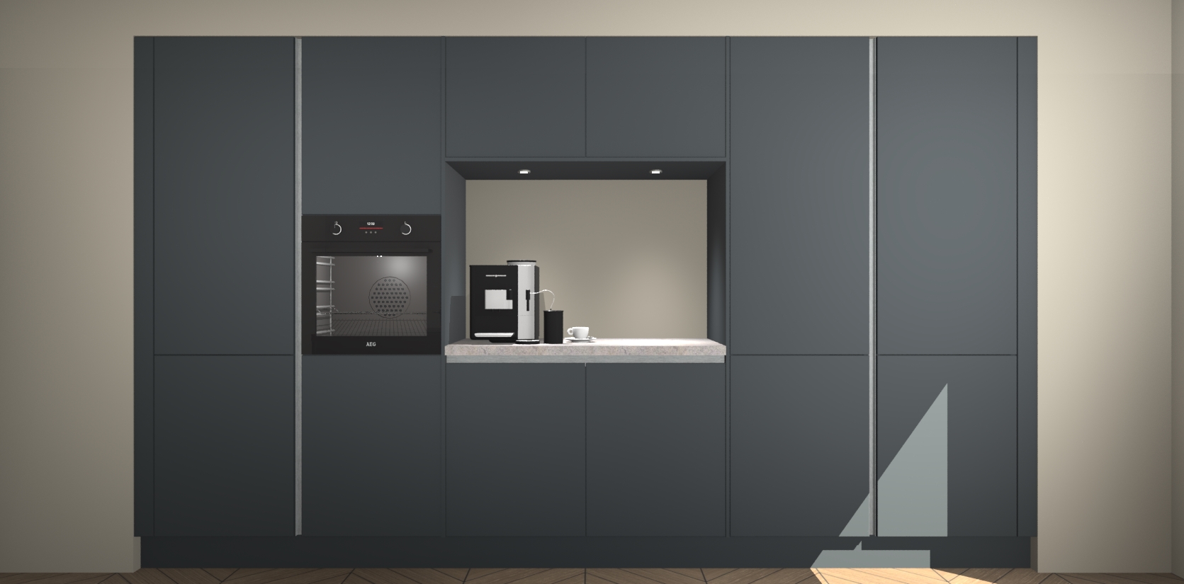 De Onyxgrijze greeploze keuken Lodz wordt geleverd met een set van 5 ingebouwde apparaten: Een oven, inductiekookplaat, afzuigkap, vaatwasser en koelkast. Deze kunnen gemakkelijk worden opgewaardeerd naar AEG. Met de gegarandeerde lage prijs en de snelle levering van 7 weken kan u er op rekenen dat de Onyxgrijze greeploze  keuken Lodz zo snel mogelijk uw huis bereikt!