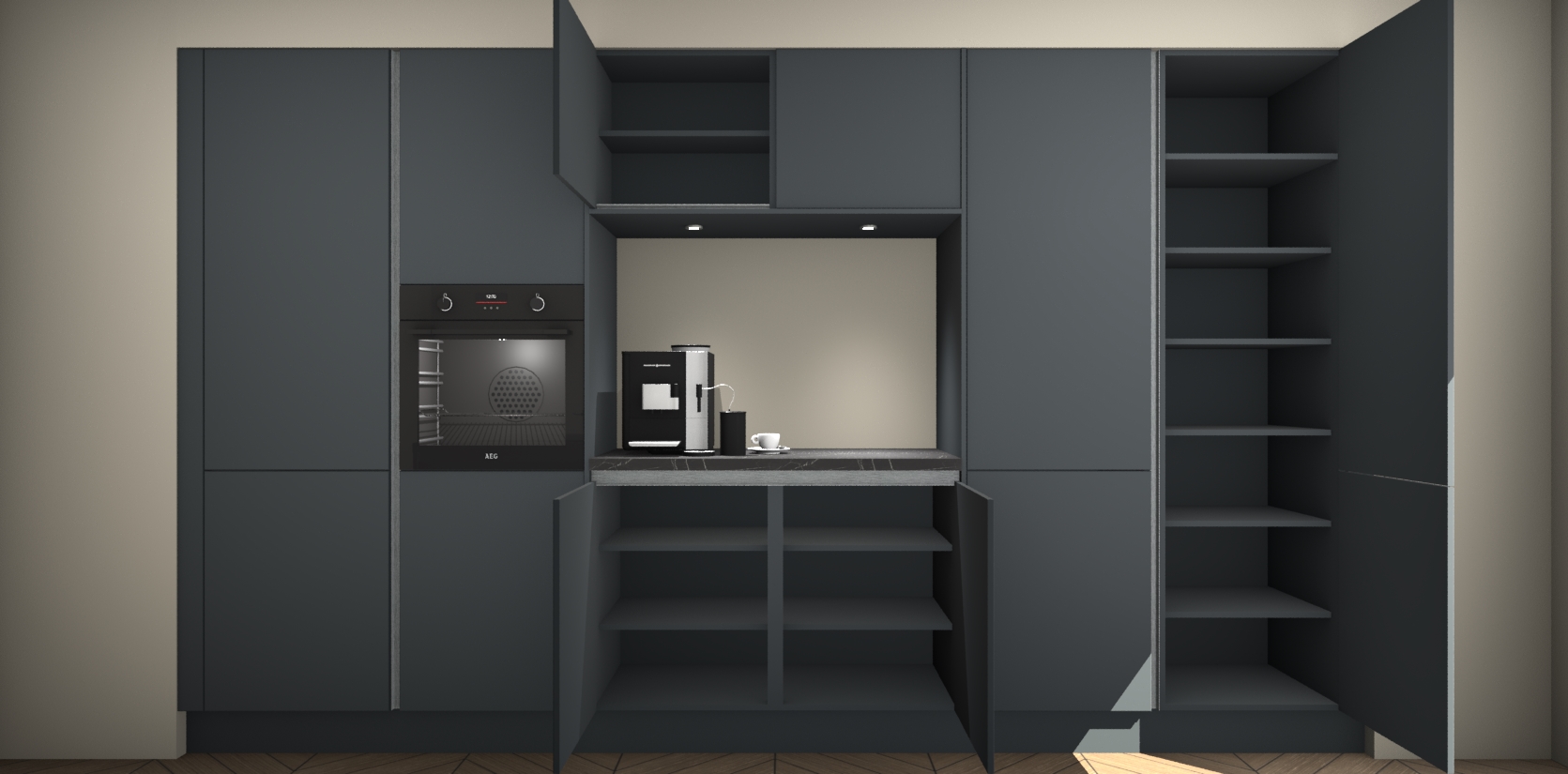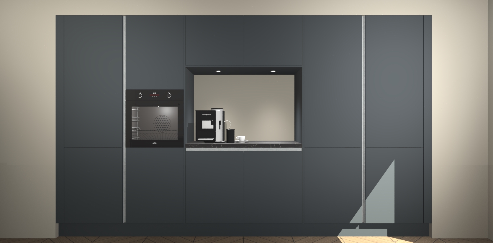 De Onyxgrijze greeploze keuken Lodz wordt geleverd met een set van 5 ingebouwde apparaten: Een oven, inductiekookplaat, afzuigkap, vaatwasser en koelkast. Deze kunnen gemakkelijk worden opgewaardeerd naar AEG. Met de gegarandeerde lage prijs en de snelle levering van 7 weken kan u er op rekenen dat de Onyxgrijze greeploze  keuken Lodz zo snel mogelijk uw huis bereikt!