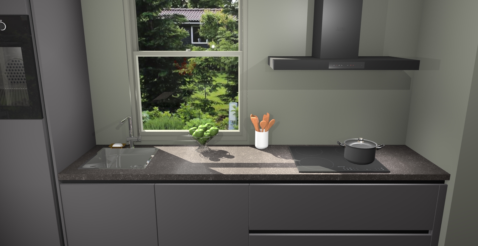 Een stijlvolle en praktische keuken als deze mag gezien worden. Dankzij de prachtige Onyxgrijze afwerking wordt de keuken gemakkelijk het middelpunt van uw huis - hij ziet er geweldig uit onder allerlei lichtomstandigheden, van dag tot nacht!