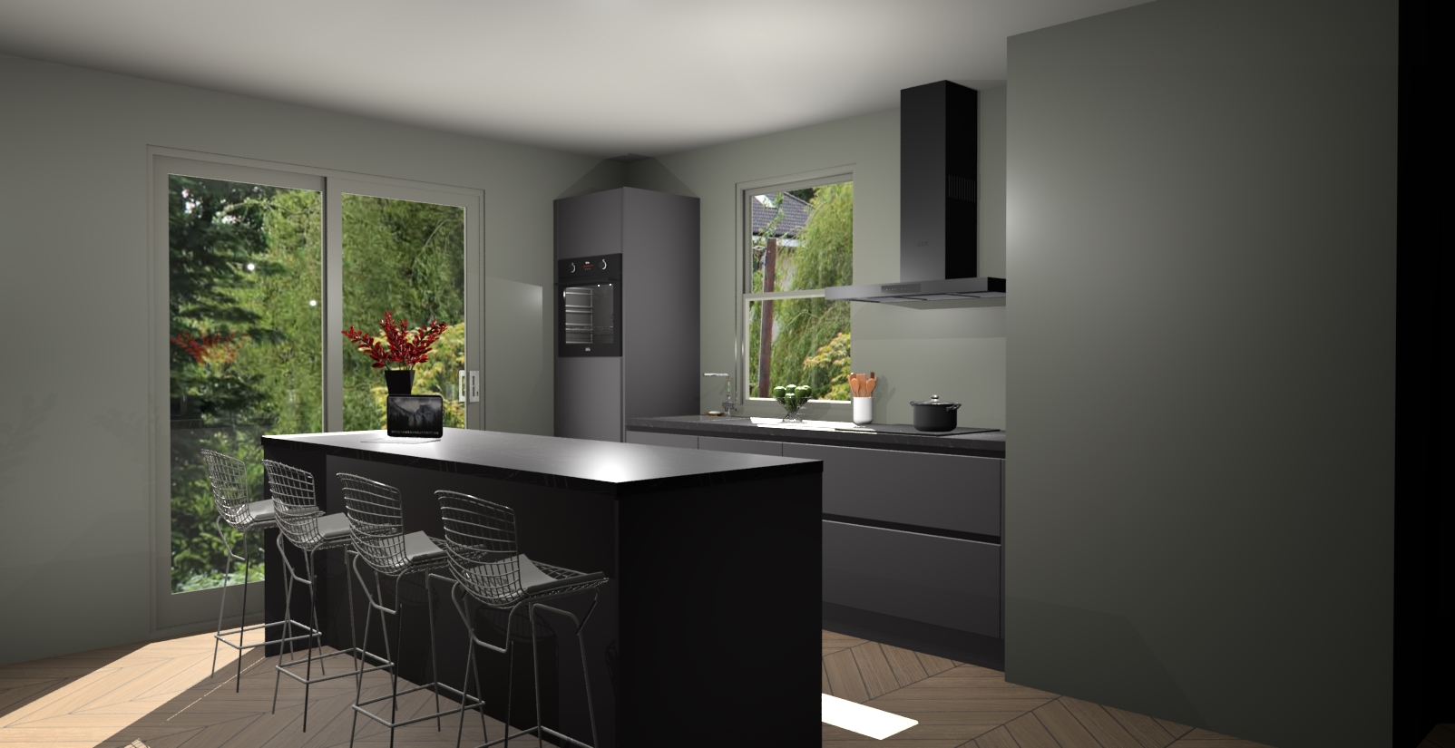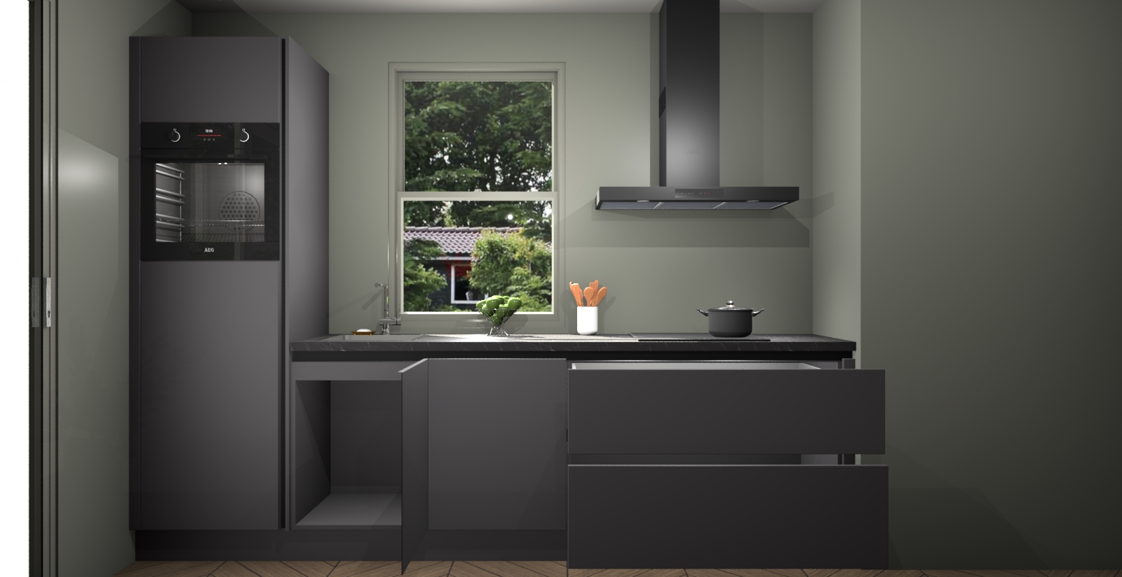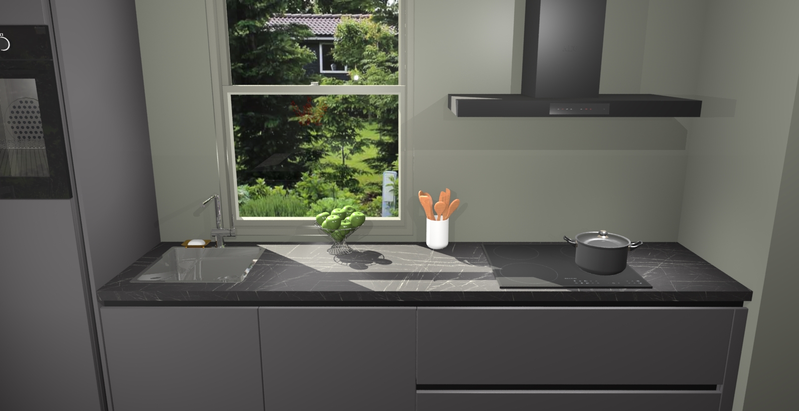 Een stijlvolle en praktische keuken als deze mag gezien worden. Dankzij de prachtige Onyxgrijze afwerking wordt de keuken gemakkelijk het middelpunt van uw huis - hij ziet er geweldig uit onder allerlei lichtomstandigheden, van dag tot nacht!