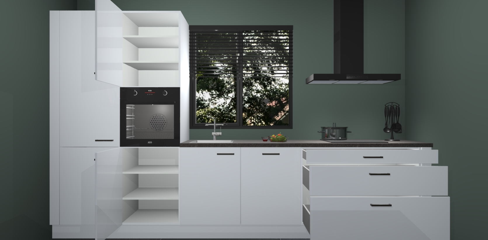 Maak kennis met de sneeuwwitte hoogglans keuken Bonaire: de perfecte balans tussen tijdloos en modern. Met voldoende opbergruimte zal deze keuken de afgunst van uw vrienden en familie zijn, terwijl uw leven moeiteloos georganiseerd en rommelvrij blijft.