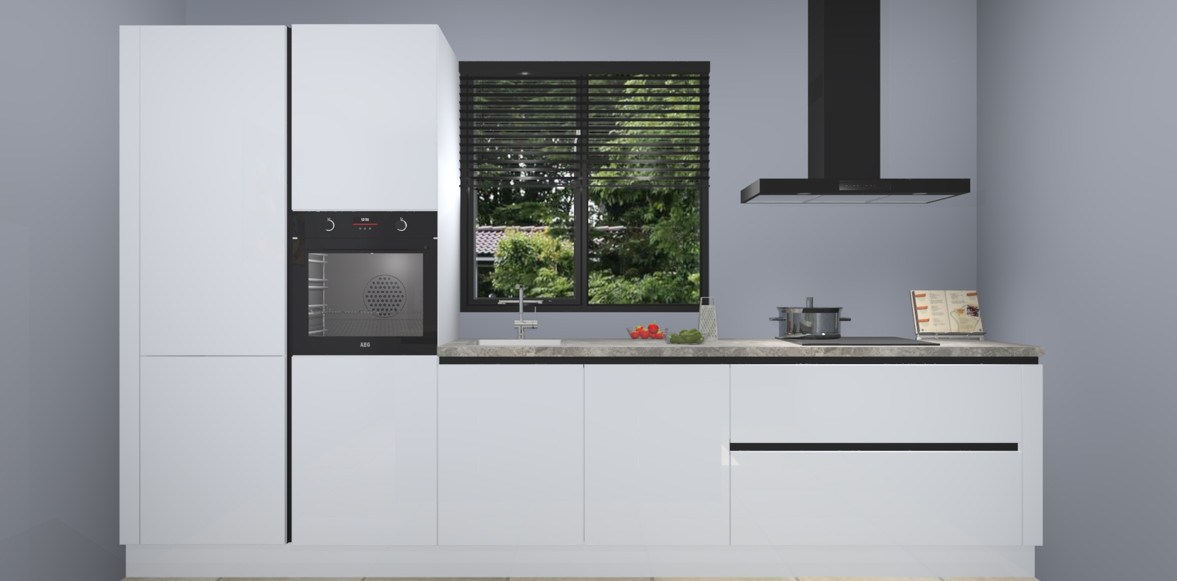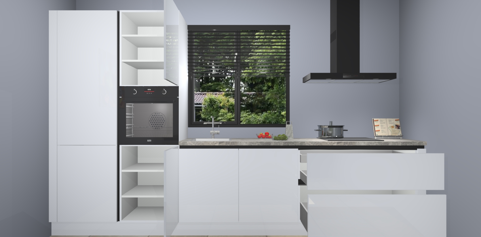 Maak kennis met de sneeuwwitte hoogglans keuken Bonaire: de perfecte balans tussen tijdloos en modern. Met voldoende opbergruimte zal deze keuken de afgunst van uw vrienden en familie zijn, terwijl uw leven moeiteloos georganiseerd en rommelvrij blijft.