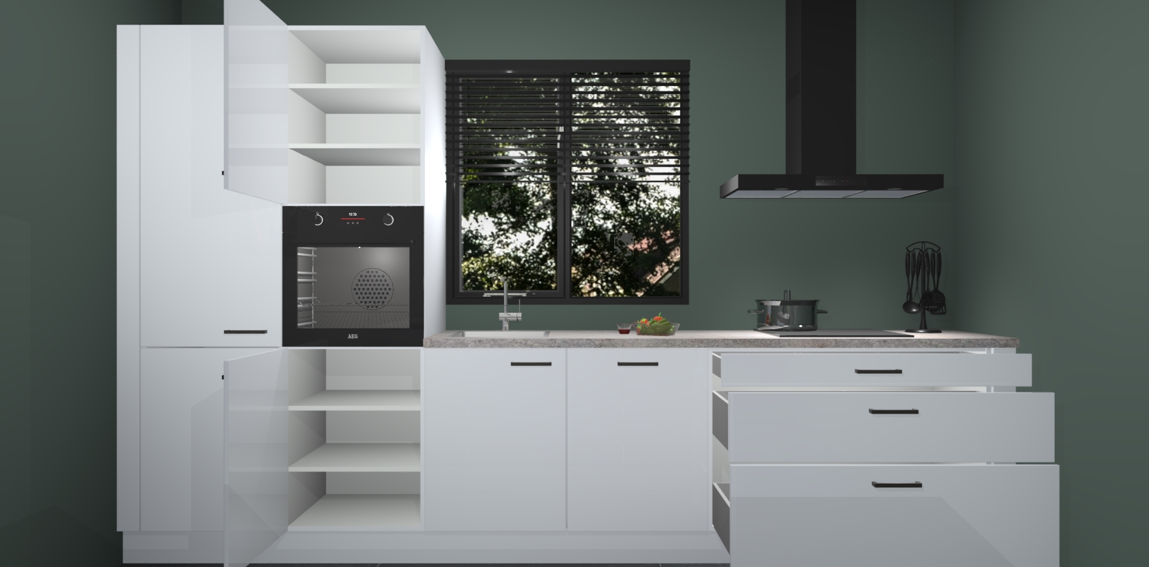 Maak kennis met de sneeuwwitte hoogglans keuken Bonaire: de perfecte balans tussen tijdloos en modern. Met voldoende opbergruimte zal deze keuken de afgunst van uw vrienden en familie zijn, terwijl uw leven moeiteloos georganiseerd en rommelvrij blijft.