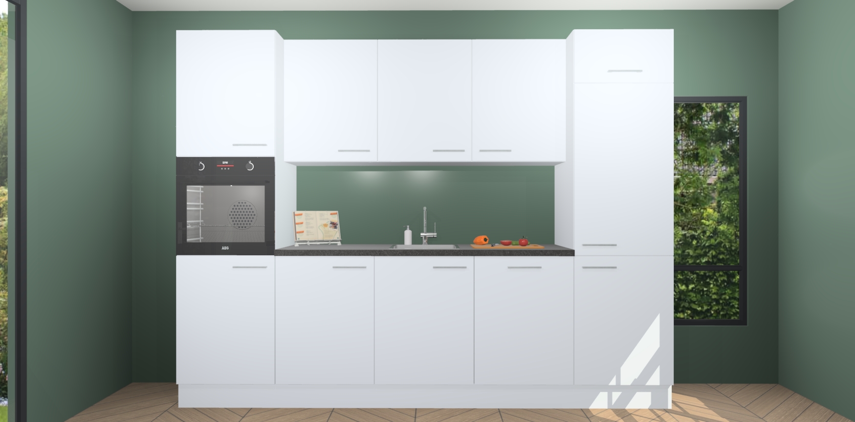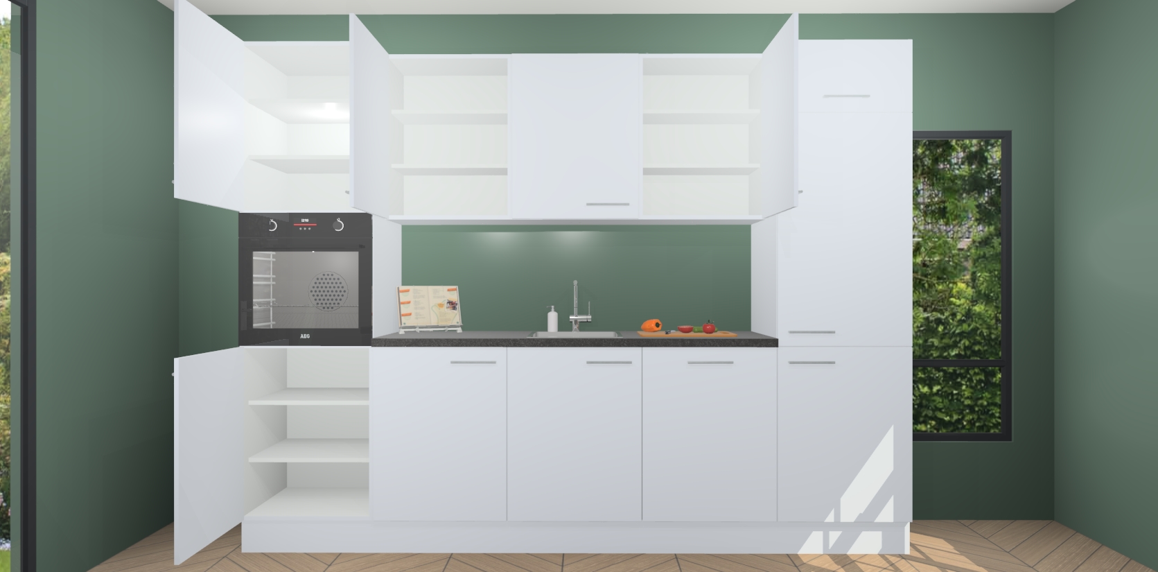 Vergeet daarnaast ook niet de 5 ingebouwde apparaten die bijgeleverd worden: oven, inductiekookplaat, afzuigkap, vaatwasser en koelkast – al deze leveringen kan u na online bestelling eventueel upgraden naar AEG upgraden of de oven vervangen met een combimagnetron indien gewenst.