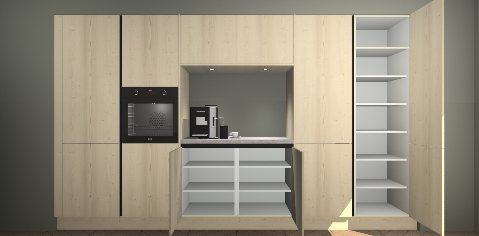 De Vuren greeploze keuken Lodz wordt geleverd met een set van 5 ingebouwde apparaten: Een oven, inductiekookplaat, afzuigkap, vaatwasser en koelkast. Deze kunnen gemakkelijk worden opgewaardeerd naar AEG. Met de gegarandeerde lage prijs en de snelle levering van 7 weken kan u er op rekenen dat de Vuren greeploze keuken Lodz zo snel mogelijk uw huis bereikt!