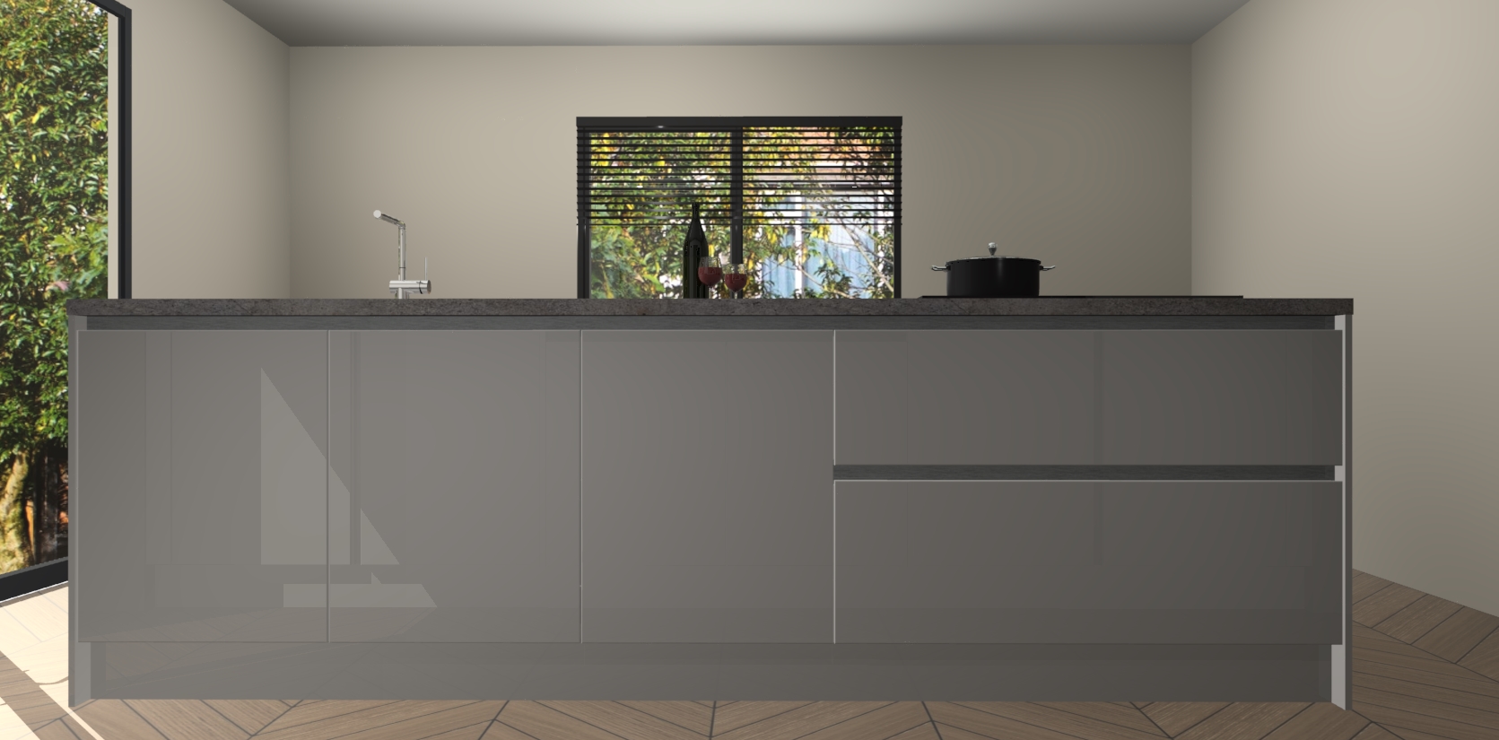 Sfeervol luxe met de zijdegrijze hoogglans greeploze keuken Lodz! Reken op een moderne look die met zijn schitterende zijdegrijze kleur en het prachtige keukeneiland echt zal schitteren in uw keuken. Met veel verschillende berging opties zult u alles kunnen opbergen wat u nodig heeft in deze hoopvolle ruimte, waaronder ook soft-close vergrendeling.