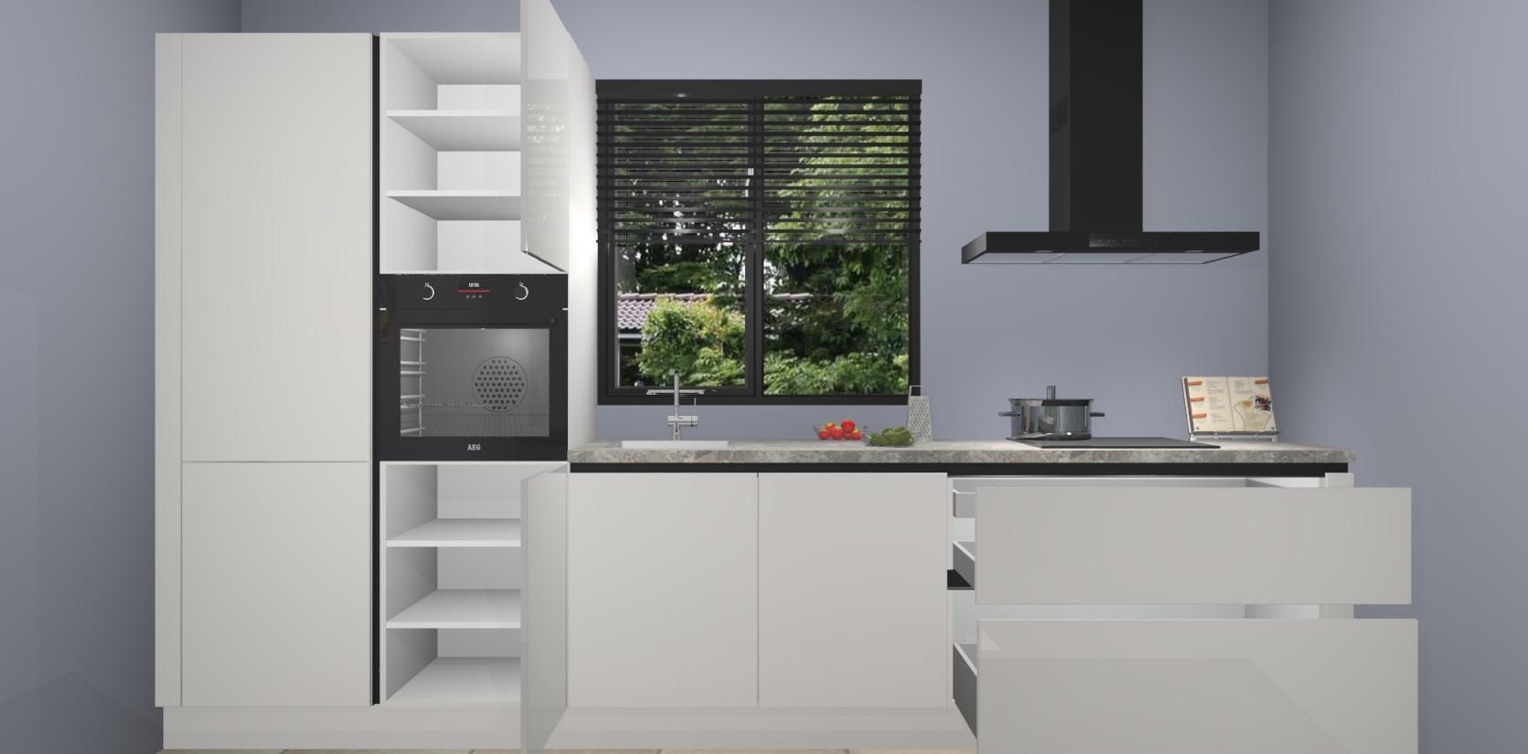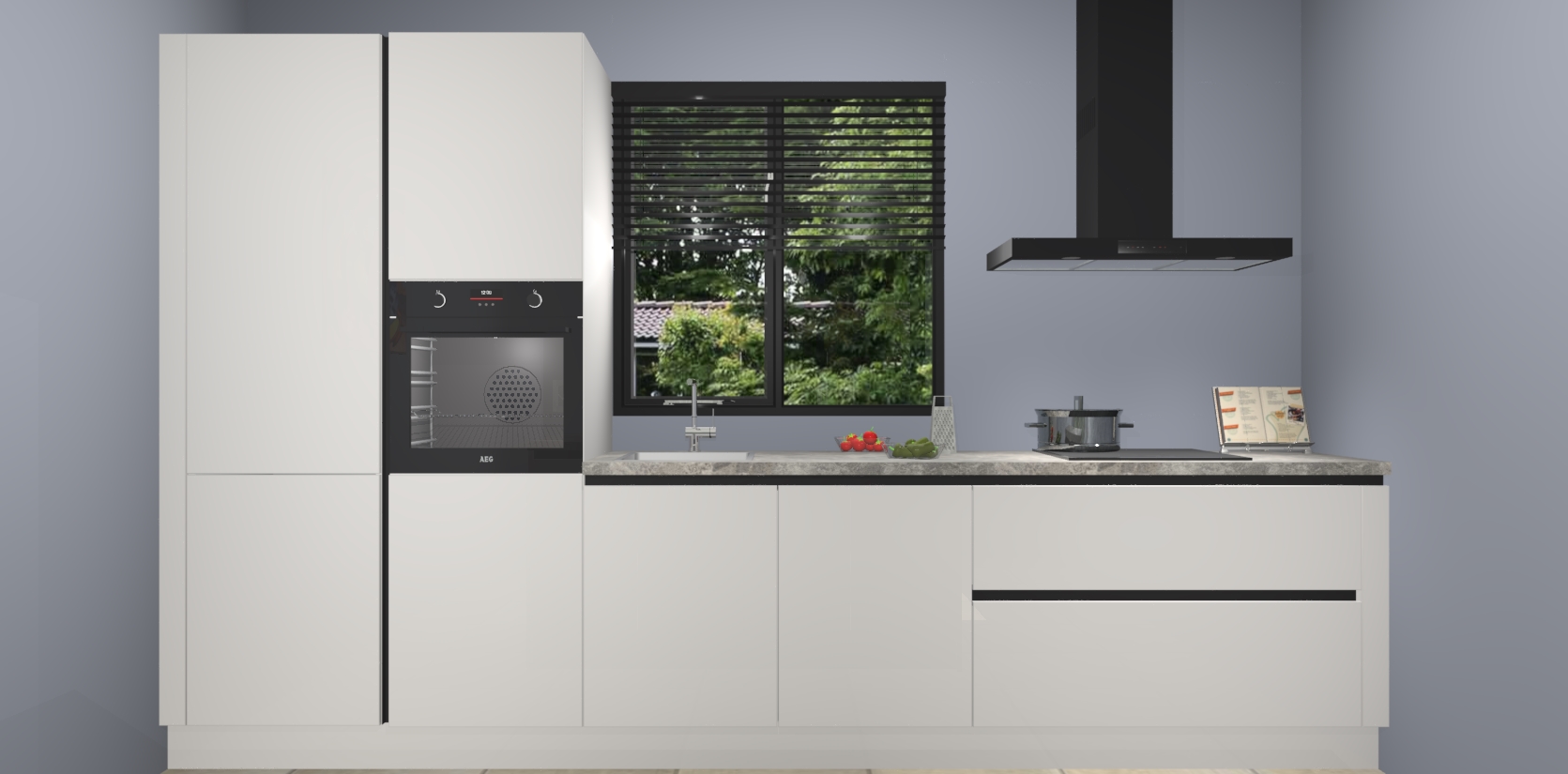 Maak kennis met de zijdegrijze hoogglans keuken Bonaire: de perfecte balans tussen tijdloos en modern. Met voldoende opbergruimte zal deze keuken de afgunst van uw vrienden en familie zijn, terwijl uw leven moeiteloos georganiseerd en rommelvrij blijft.