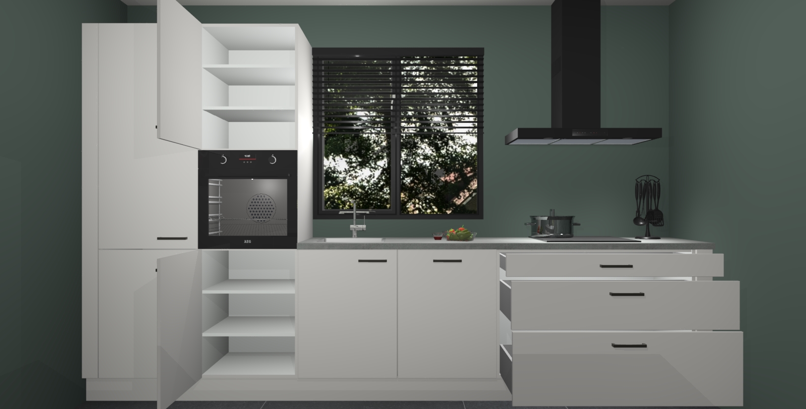 Maak kennis met de zijdegrijze keuken Bonaire: de perfecte balans tussen tijdloos en modern. Met voldoende opbergruimte zal deze keuken de afgunst van uw vrienden en familie zijn, terwijl uw leven moeiteloos georganiseerd en rommelvrij blijft.