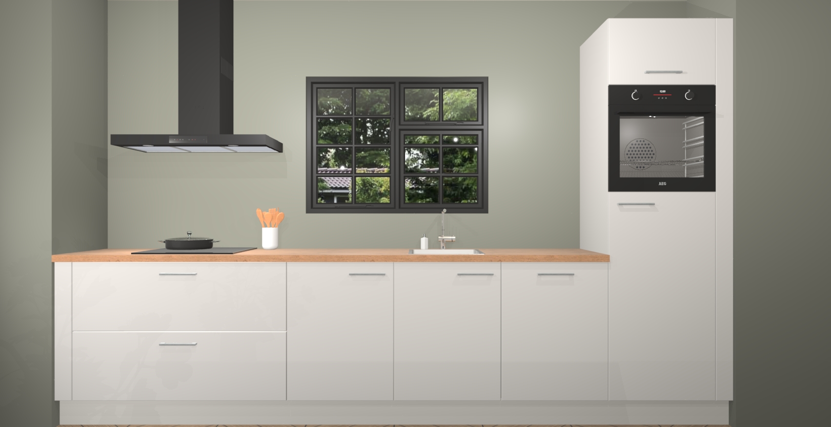 Maak kennis met de zijdegrijze keuken Palau: de perfecte mix van stijl en gemak. De keuken heeft vijf inbouw apparaten, plus een werkblad in houtlook dat meteen warmte en verfijning toevoegt.