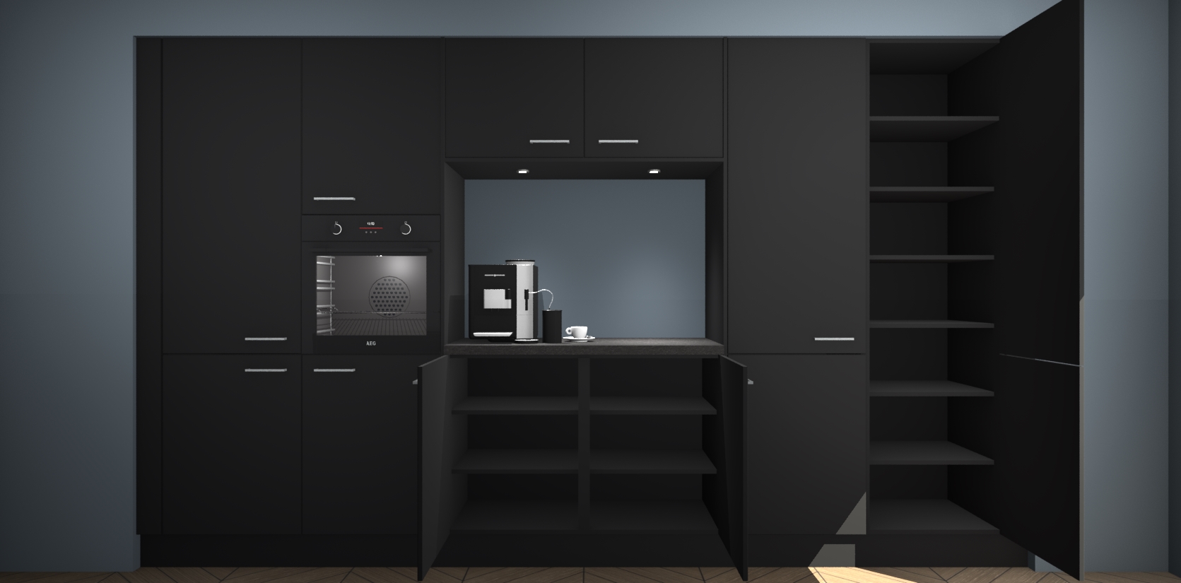 De Zwarte keuken Lodz wordt geleverd met een set van 5 ingebouwde apparaten: Een oven, inductiekookplaat, afzuigkap, vaatwasser en koelkast. Deze kunnen gemakkelijk worden opgewaardeerd naar AEG. Met de gegarandeerde lage prijs en de snelle levering van 7 weken kan u er op rekenen dat de Zwarte keuken Lodz zo snel mogelijk uw huis bereikt!