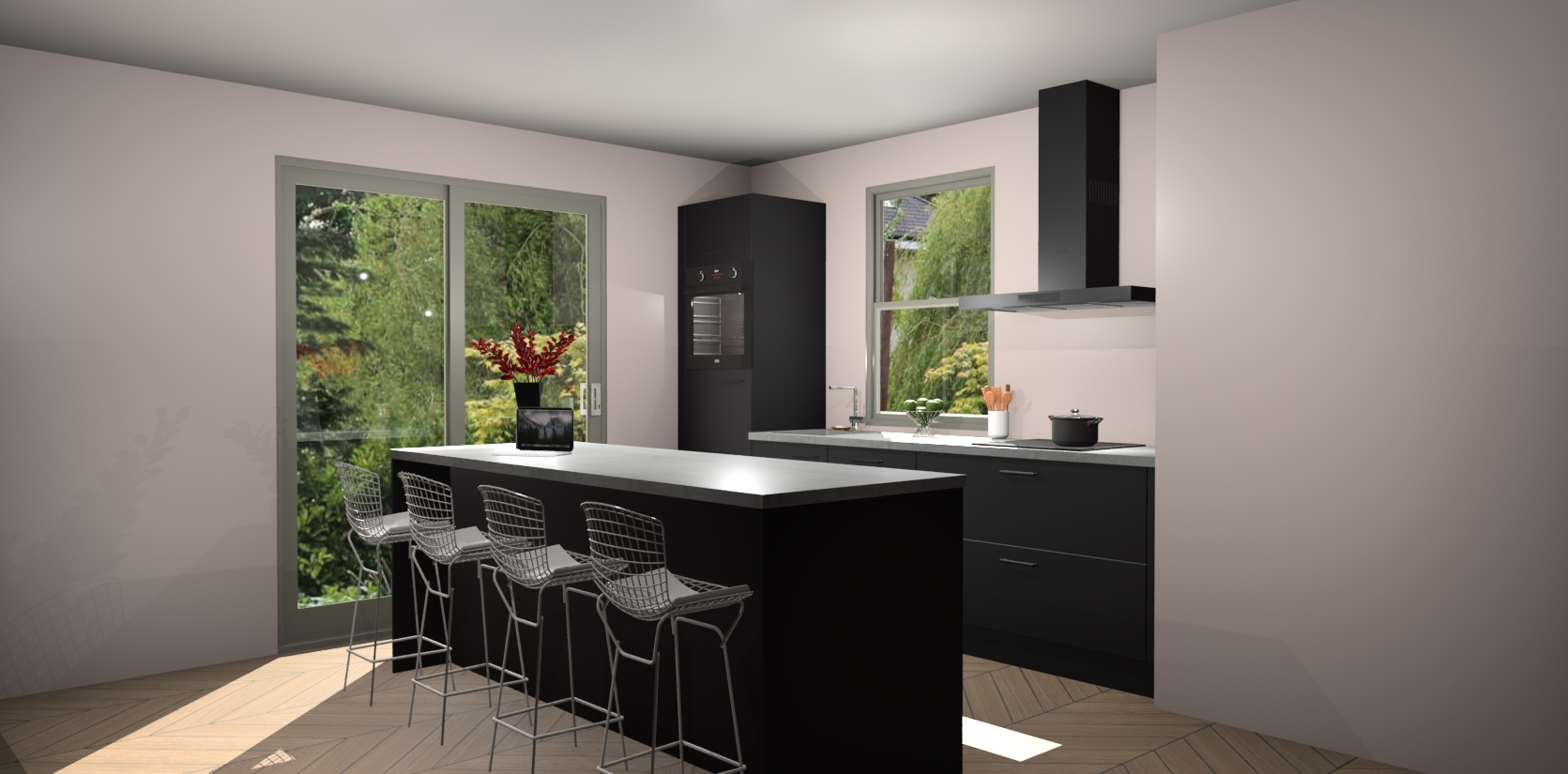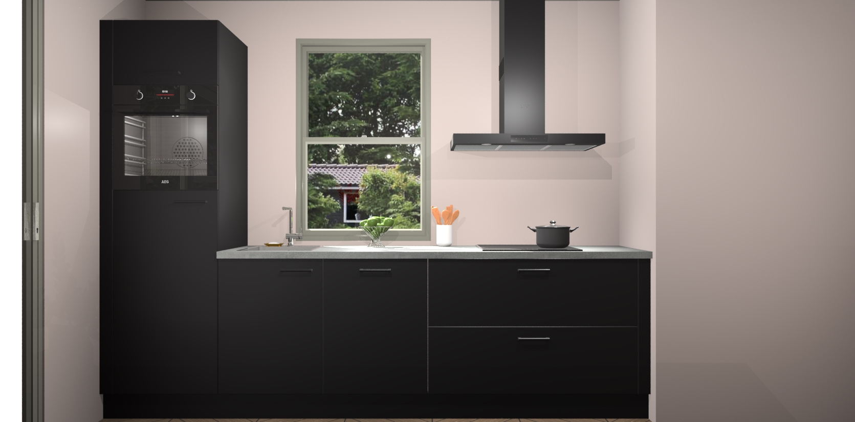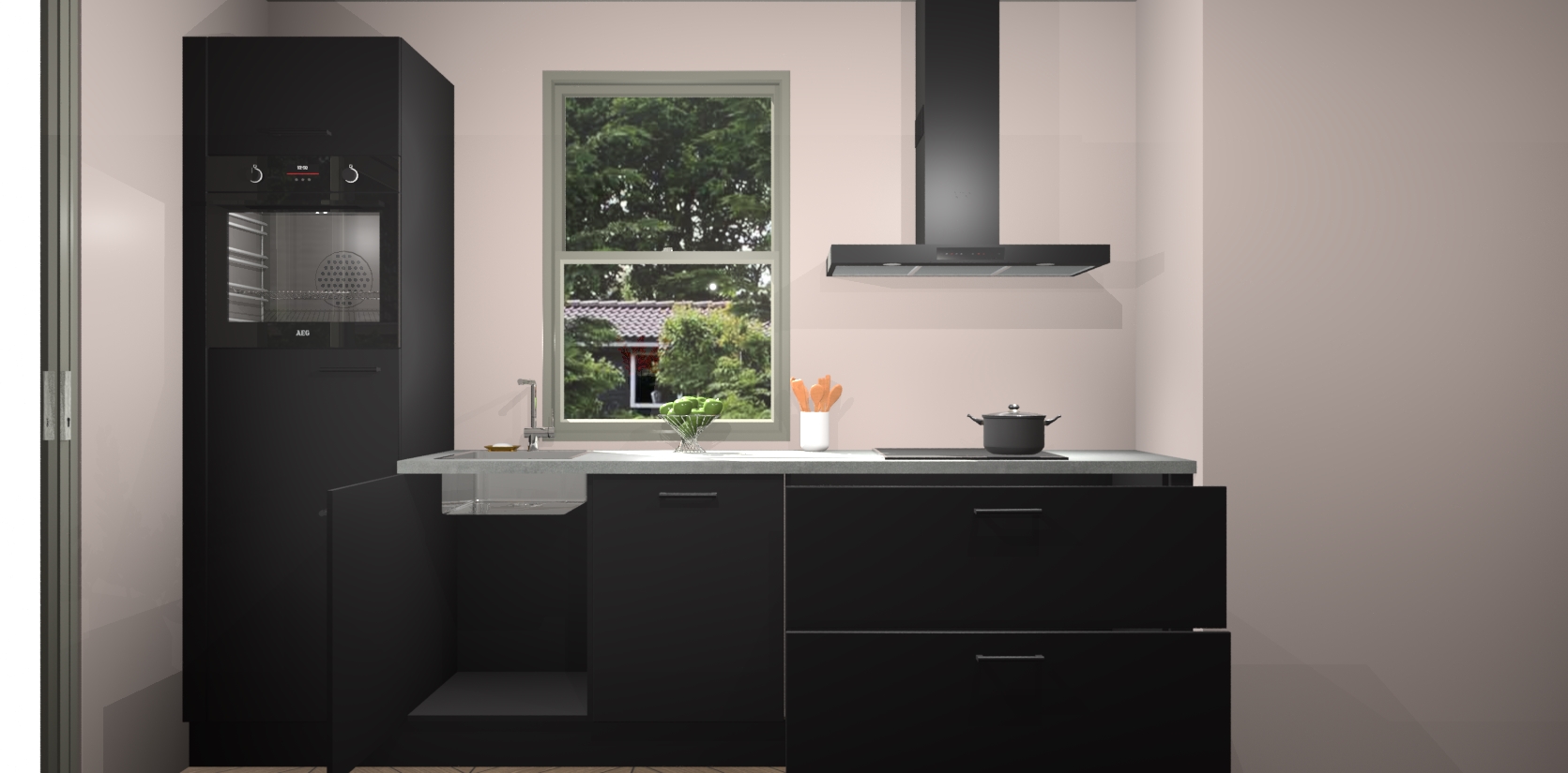 Een stijlvolle en praktische keuken als deze mag gezien worden. Dankzij de prachtige Zwarte afwerking wordt de keuken gemakkelijk het middelpunt van uw huis - hij ziet er geweldig uit onder allerlei lichtomstandigheden, van dag tot nacht!