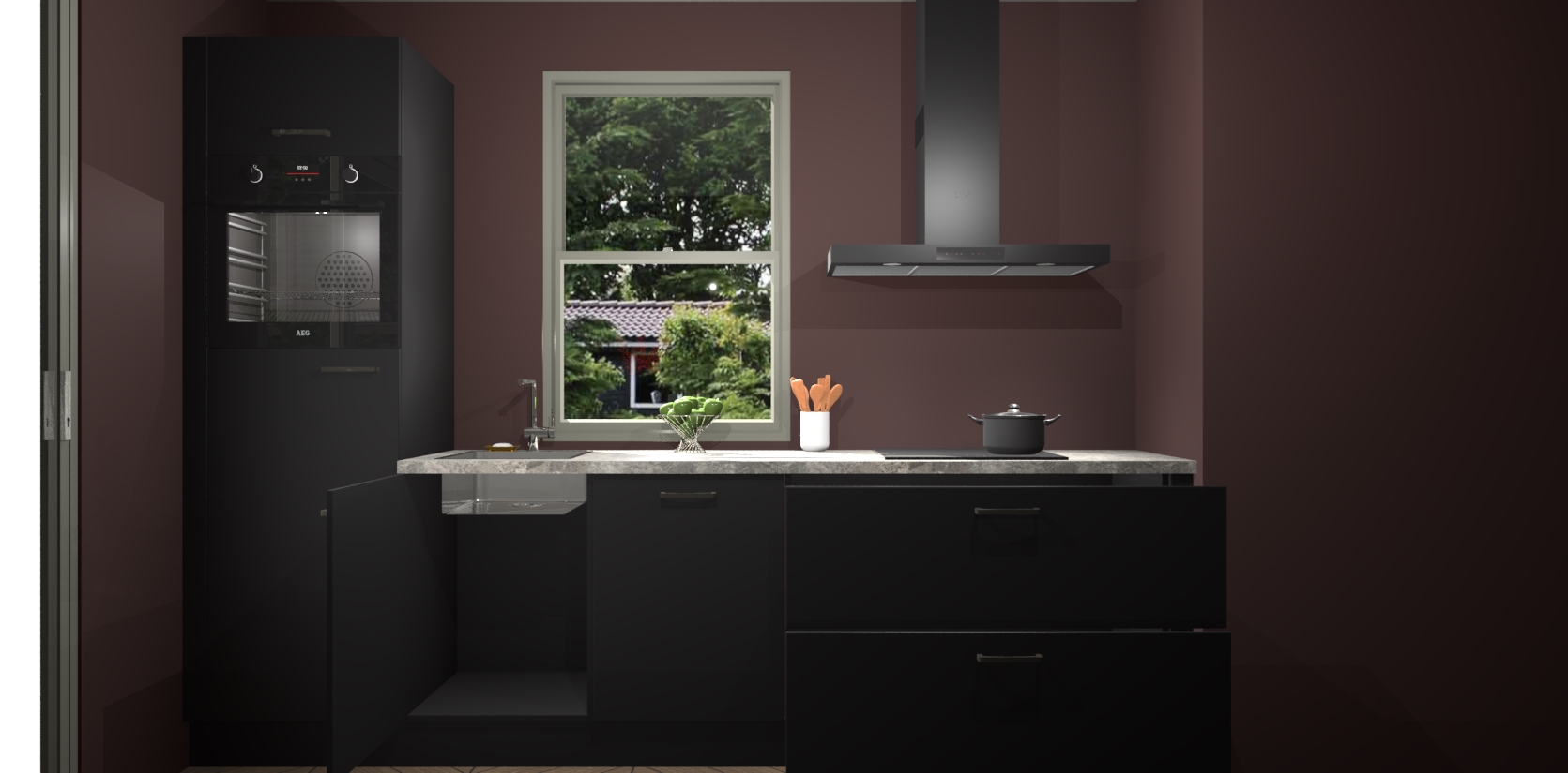 Een stijlvolle en praktische keuken als deze mag gezien worden. Dankzij de prachtige Zwarte afwerking wordt de keuken gemakkelijk het middelpunt van uw huis - hij ziet er geweldig uit onder allerlei lichtomstandigheden, van dag tot nacht!