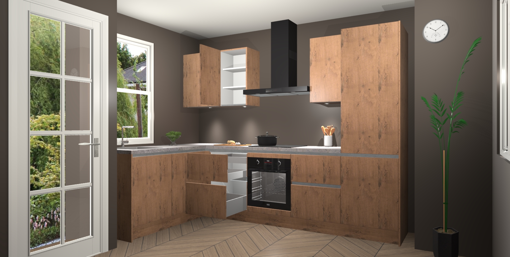 U hoeft zich ook geen zorgen te maken over een gebrek aan opbergruimte, want deze keuken heeft voldoende opbergmogelijkheden zowel boven als onder het aanrecht. Om het leven nog makkelijker te maken, wordt deze moderne hoekkeuken geleverd met 5 ingebouwde apparaten, waaronder een oven, inductiekookplaat, afzuigkap, vaatwasser en koelkast, zodat u in een mum van tijd klaar bent voor actie!