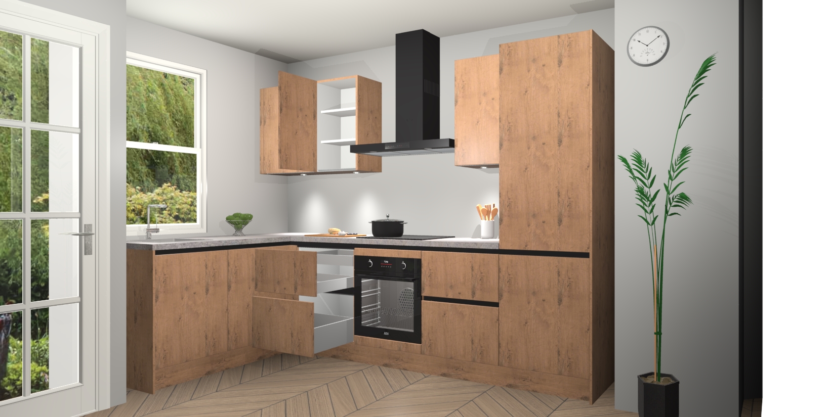 U hoeft zich ook geen zorgen te maken over een gebrek aan opbergruimte, want deze keuken heeft voldoende opbergmogelijkheden zowel boven als onder het aanrecht. Om het leven nog makkelijker te maken, wordt deze moderne hoekkeuken geleverd met 5 ingebouwde apparaten, waaronder een oven, inductiekookplaat, afzuigkap, vaatwasser en koelkast, zodat u in een mum van tijd klaar bent voor actie!
