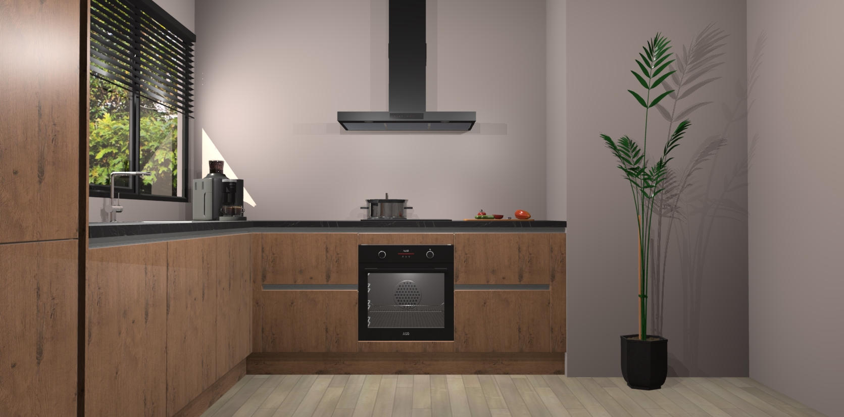 Met een modern, tijdloos design en ruime opslagruimte, zult u zich in no-time thuis voelen in uw nieuwe keuken. Uw leven wordt eenvoudiger met de soft-close deuren die voor het ultieme stille comfort zorgen - geen geluid dat u stoort terwijl u kookt. Ook is de keuken voorzien van 5 ingebouwde apparaten: een oven, inductie kookplaat, afzuigkap, vaatwasser en koelkast. Deze kunnen gemakkelijk na bestelling worden bijgewerkt naar AEG - waardoor uw luxe ervaring compleet is.