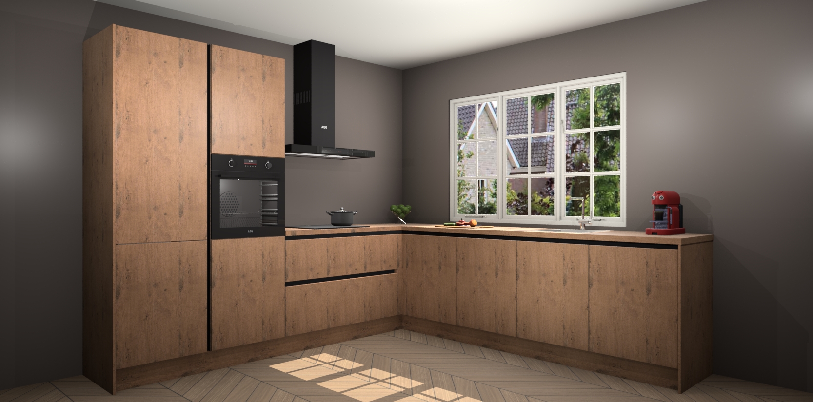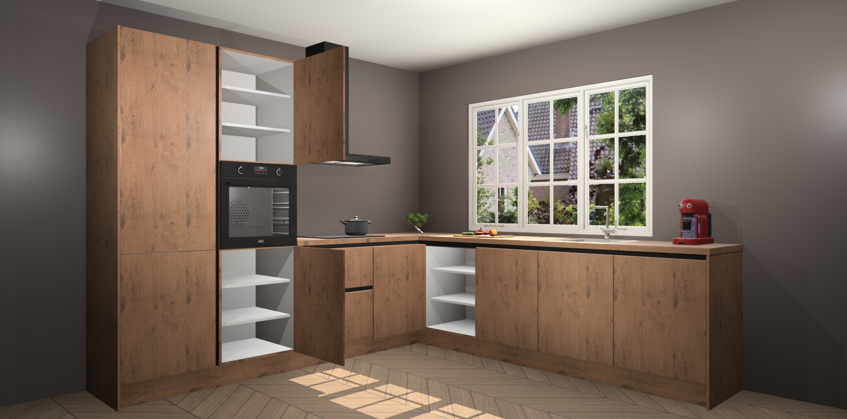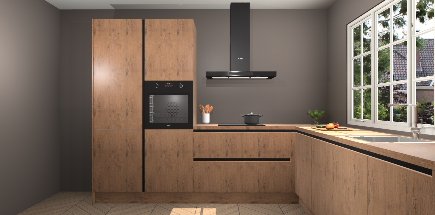 De keuken heeft veel opbergruimte, waardoor u alle ingrediënten gemakkelijk bereikbaar hebt staan. En daarnaast bevat deze volledig uitgeruste keuken ook 5 ingebouwde apparaten: een oven, inductiekookplaat, afzuigkap, vaatwasser en koelkast. Deze zijn heel eenvoudig na bestellen te upgraden naar AEG als u dit wilt. Bovendien zijn de softclose-kastdeuren ideaal; geef ze gewoon even een tikje en ze sluiten automatisch met geruisloze precisie.