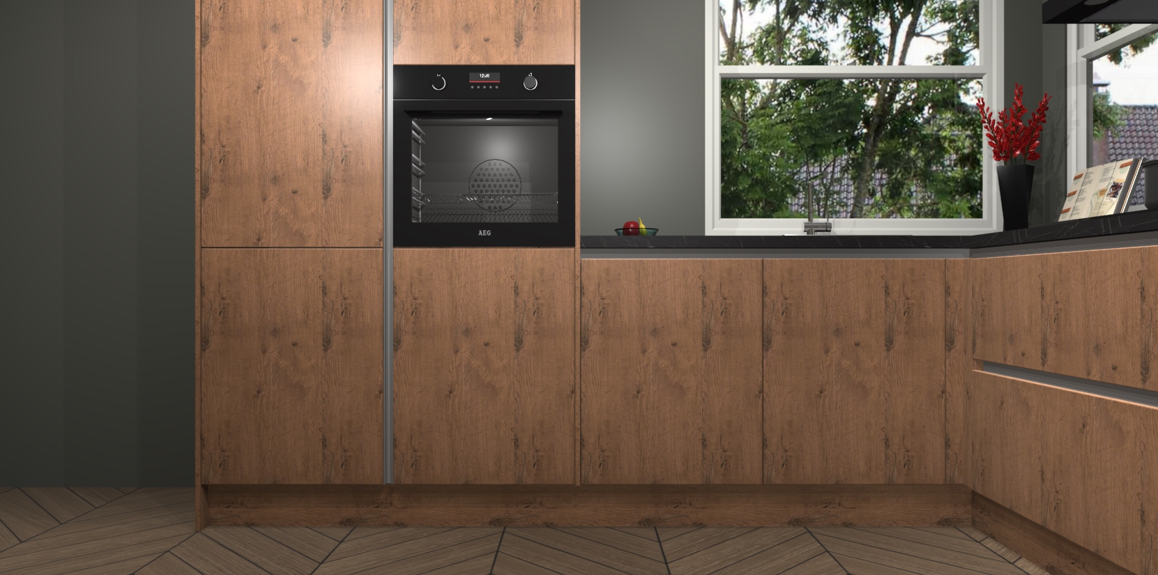 De Astoria Eiken greeploze keuken Kotor wordt geleverd met vijf inbouwapparaten, waaronder een oven, inductiekookplaat, afzuigkap, vaatwasser en koelkast. En als u uw apparatuur wilt upgraden, kunnen we u na bestelling eenvoudig helpen overstappen naar AEG. Bovendien heeft deze keuken soft close deuren, zodat lades en kastjes geruisloos en zonder klepperen sluiten!