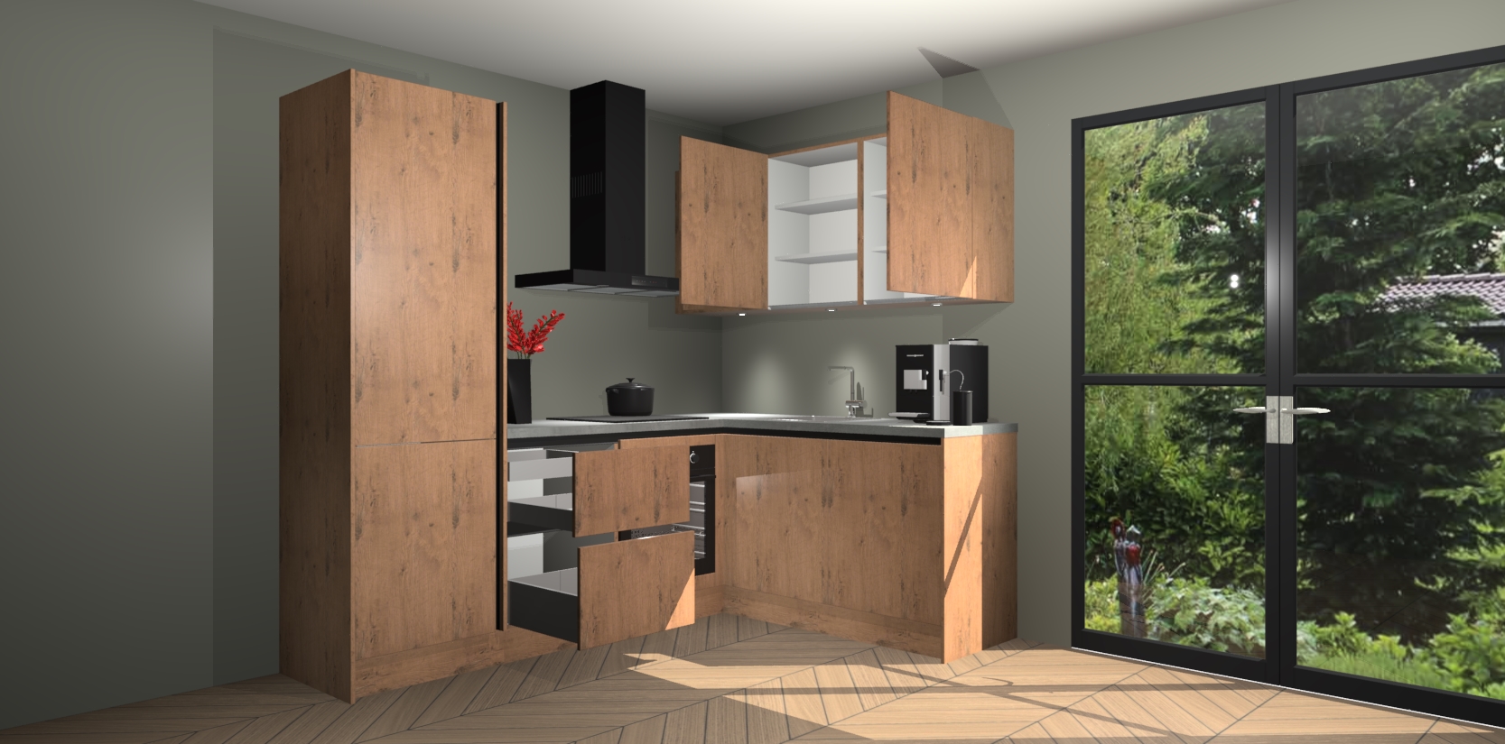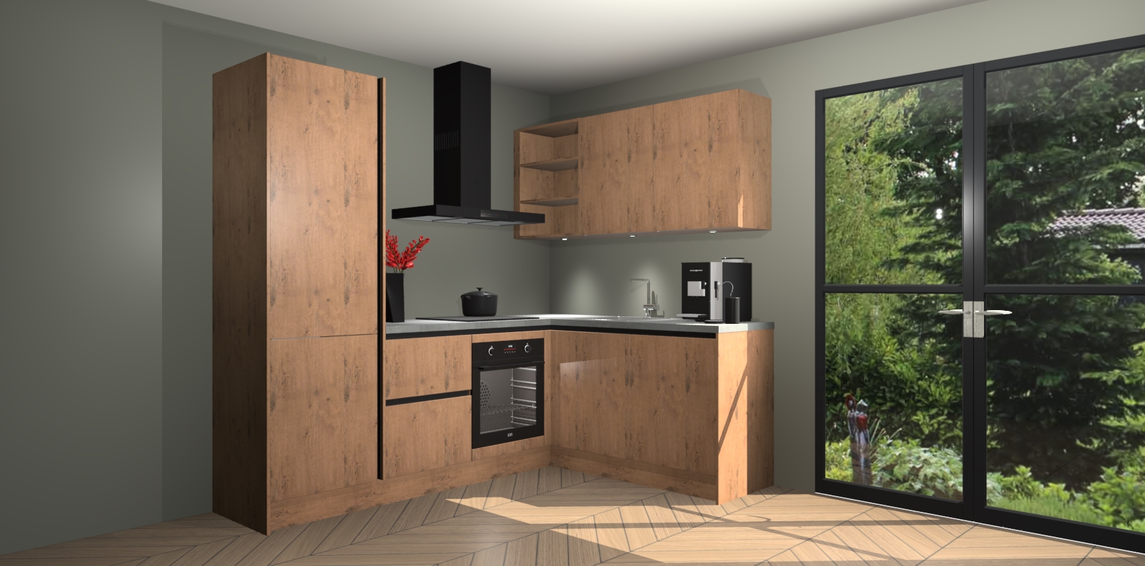 Wauw, dit is de Astoria Eiken greeploze keuken Pilsen! U kunt gerust zeggen dat u elegantie combineert met functionaliteit met deze keuken. Met een modern en chique ontwerp is de keuken precies wat u nodig heeft om uw ruimte te verfraaien. De binnenzijde van de kasten is in dezelfde donkere kleur als de buitenzijde voor een uniforme look, compleet met softclose-kasten die stil sluiten.