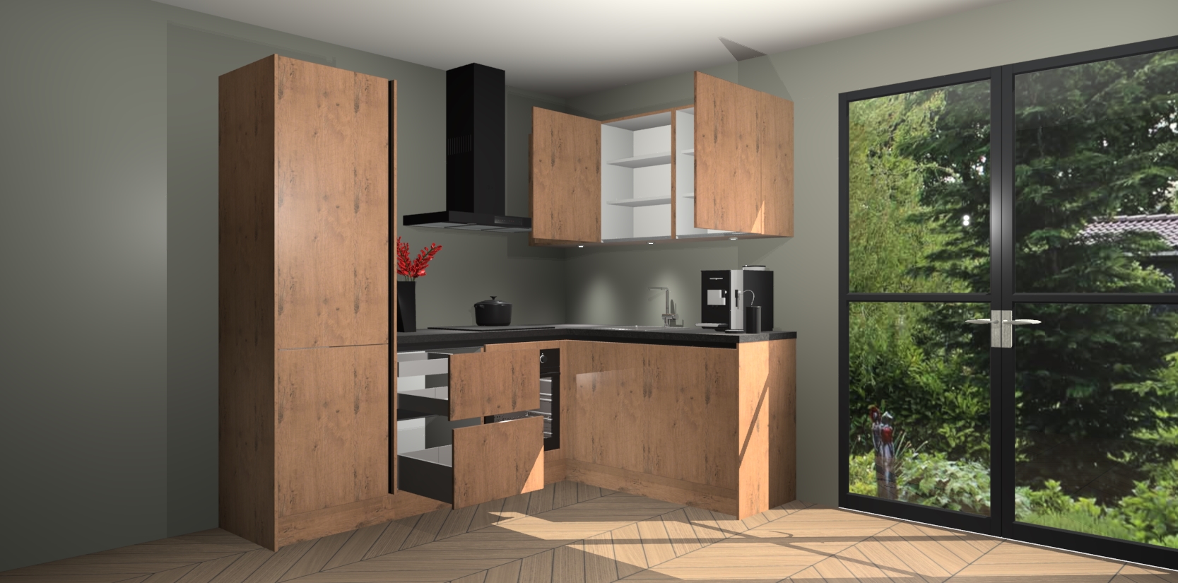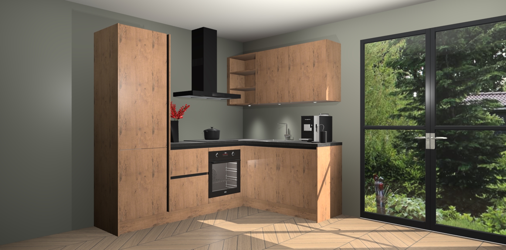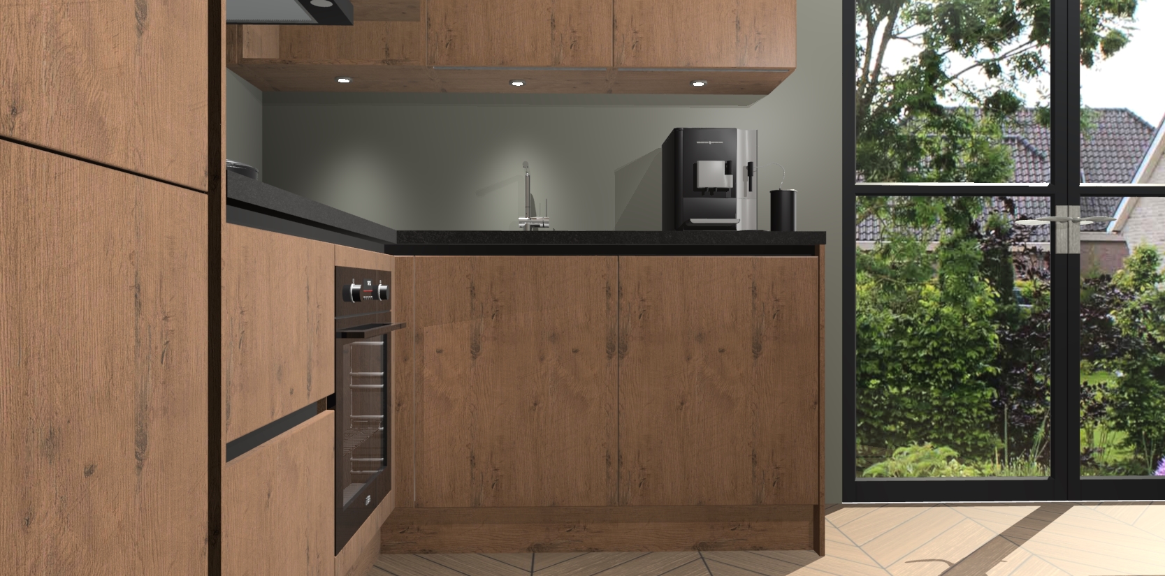 Wauw, dit is de Astoria Eiken greeploze keuken Pilsen! U kunt gerust zeggen dat u elegantie combineert met functionaliteit met deze keuken. Met een modern en chique ontwerp is de keuken precies wat u nodig heeft om uw ruimte te verfraaien. De binnenzijde van de kasten is in dezelfde donkere kleur als de buitenzijde voor een uniforme look, compleet met softclose-kasten die stil sluiten.