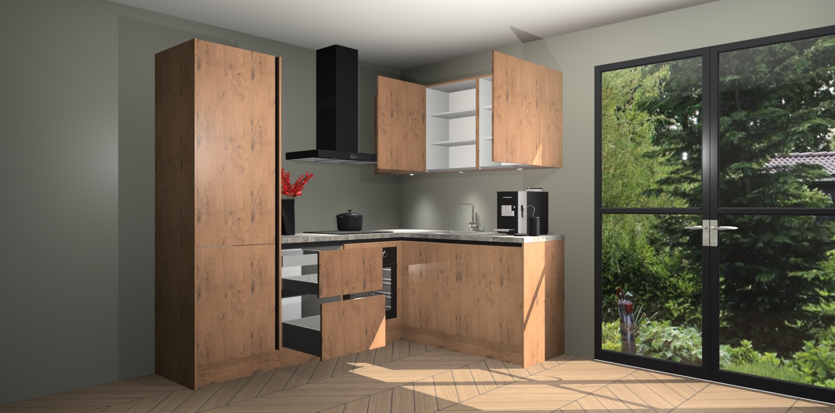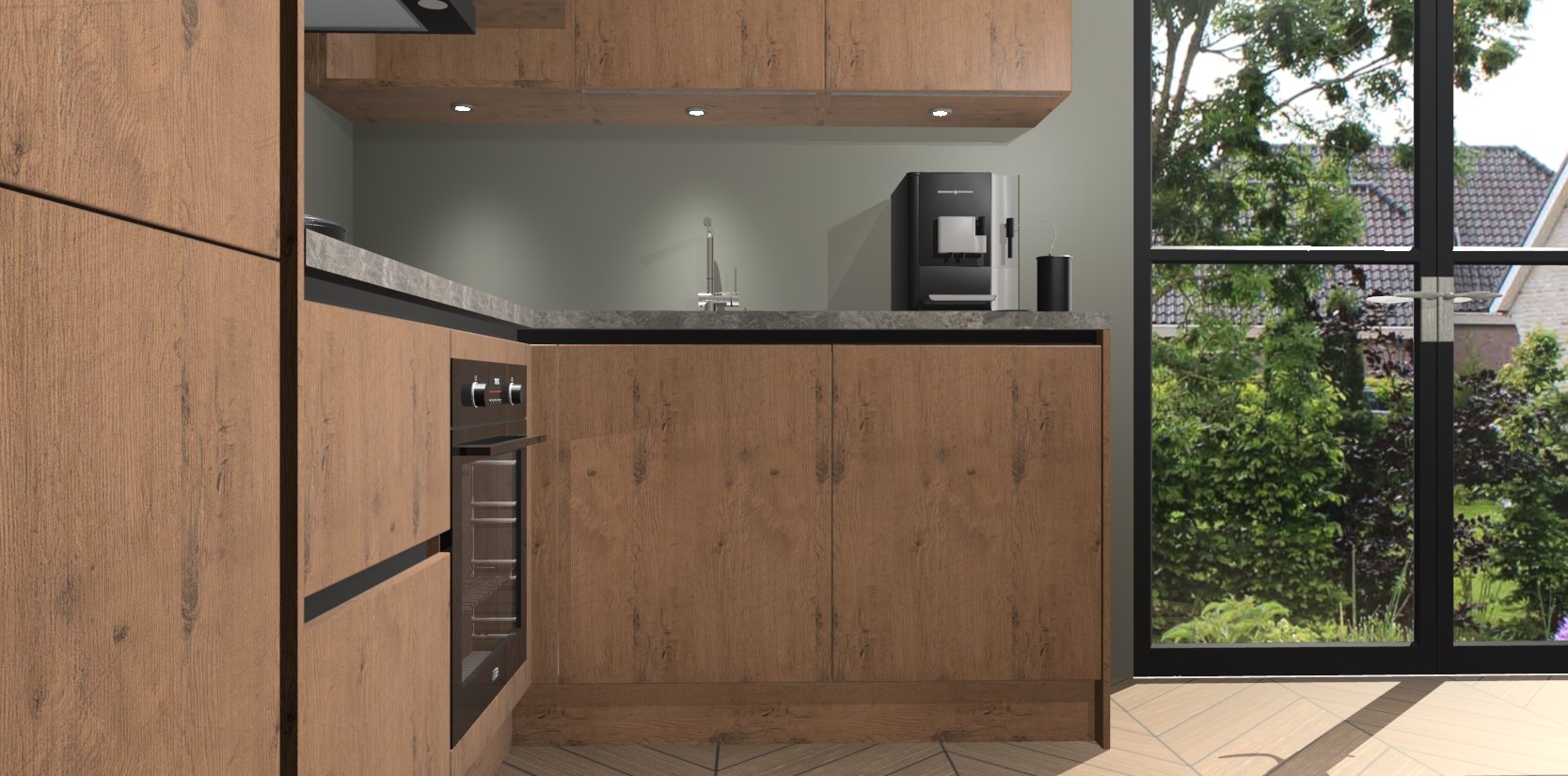 Wauw, dit is de Astoria Eiken greeploze keuken Pilsen! U kunt gerust zeggen dat u elegantie combineert met functionaliteit met deze keuken. Met een modern en chique ontwerp is de keuken precies wat u nodig heeft om uw ruimte te verfraaien. De binnenzijde van de kasten is in dezelfde donkere kleur als de buitenzijde voor een uniforme look, compleet met softclose-kasten die stil sluiten.
