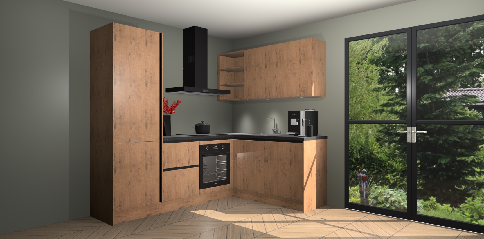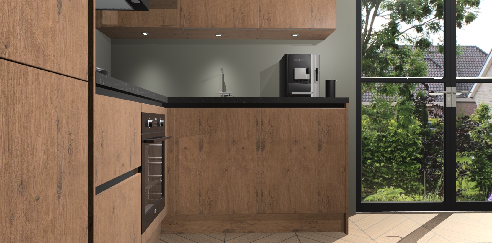 Wauw, dit is de Astoria Eiken greeploze keuken Pilsen! U kunt gerust zeggen dat u elegantie combineert met functionaliteit met deze keuken. Met een modern en chique ontwerp is de keuken precies wat u nodig heeft om uw ruimte te verfraaien. De binnenzijde van de kasten is in dezelfde donkere kleur als de buitenzijde voor een uniforme look, compleet met softclose-kasten die stil sluiten.