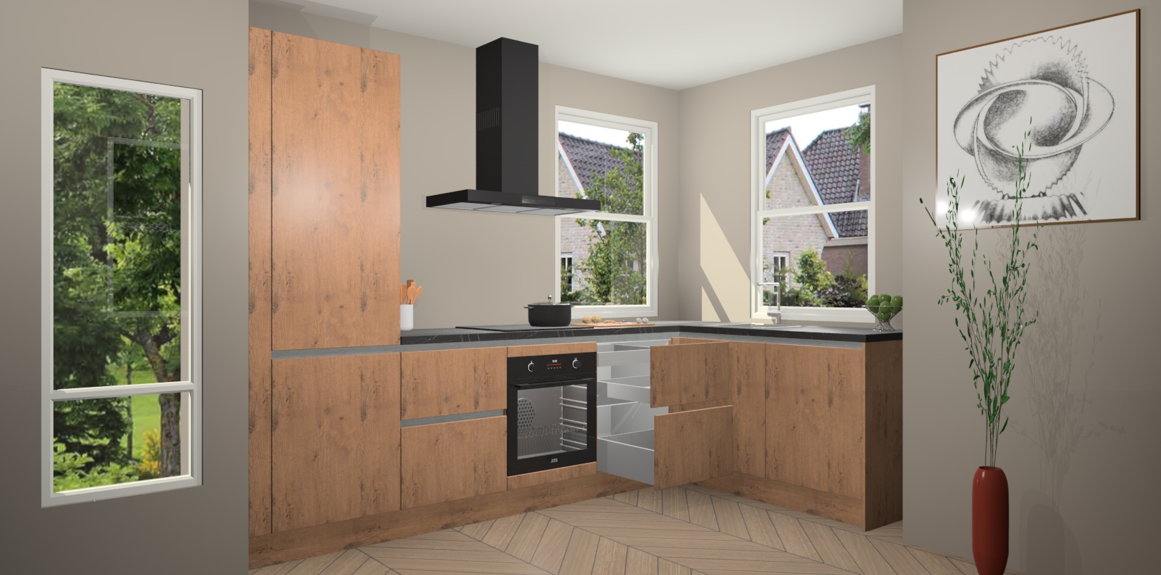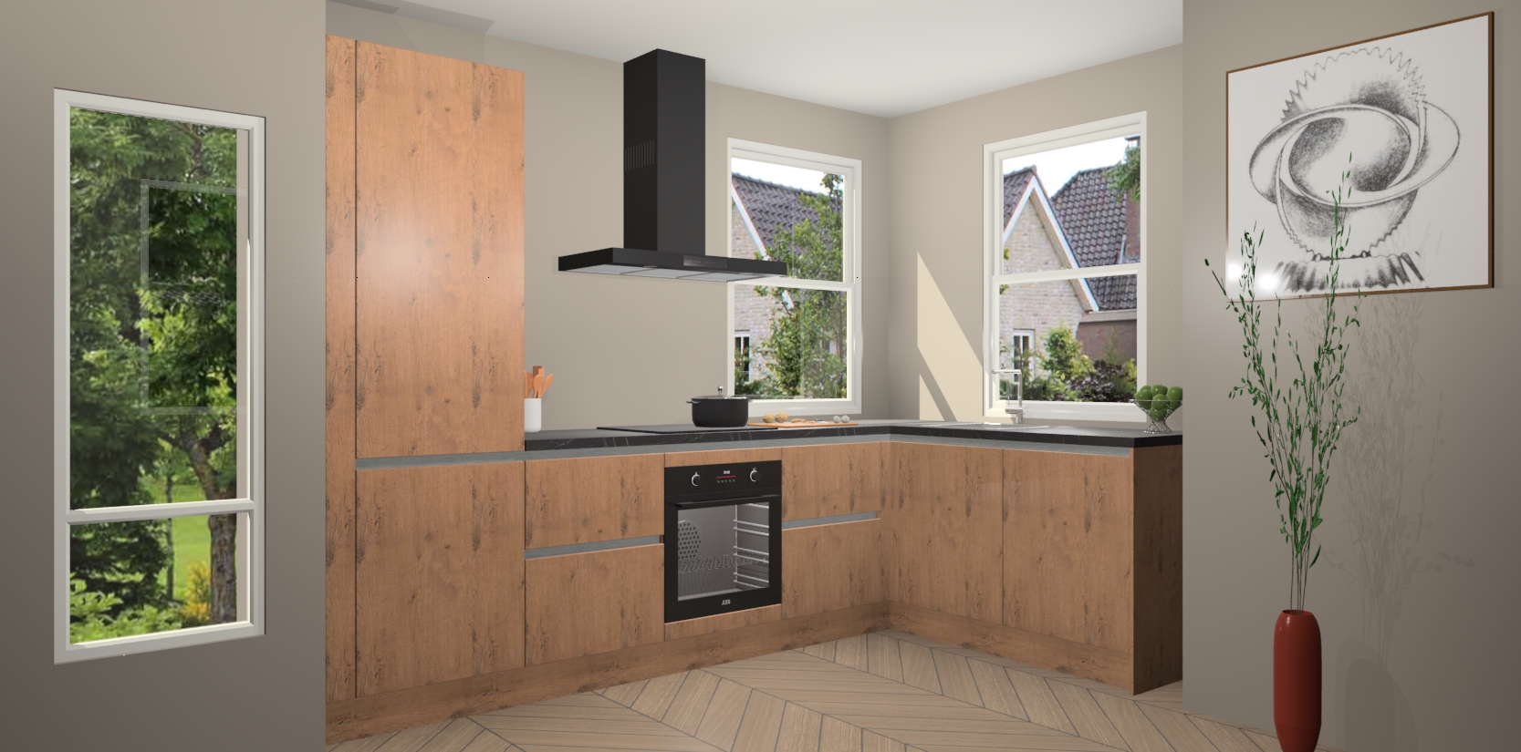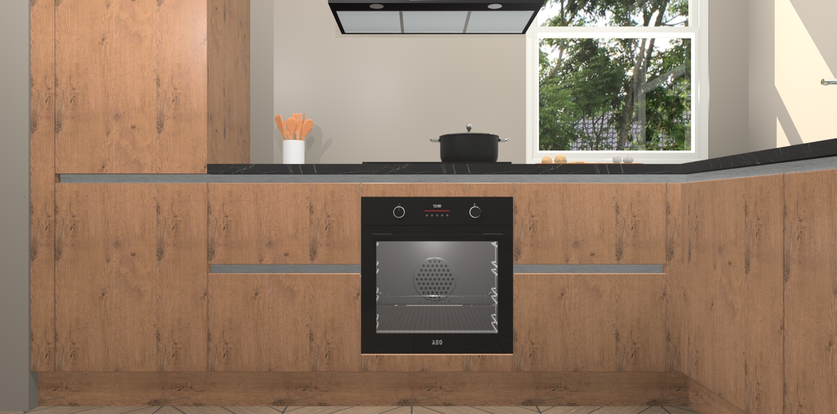 Wat maakt deze keuken zo bijzonder? Ten eerste geeft het houten werkblad uw ruimte een onmiskenbaar klassieke uitstraling. De natuurlijke afwerking roept warmte en elegantie op die nooit uit de mode zullen raken. Bovendien is het gemakkelijk schoon te houden en te onderhouden, zodat je er jarenlang plezier van kunt hebben. Als u op zoek bent naar extra gemak in uw keuken, dan heeft u bij het plaatsen van een bestelling bij ons ook de optie om uw toestellen te upgraden naar AEG-modellen - zo haalt u moderne innovatie van topmerken in apparatentechnologie rechtstreeks in huis.