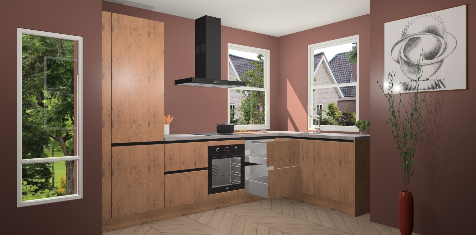 Wat maakt deze keuken zo bijzonder? Ten eerste geeft het houten werkblad uw ruimte een onmiskenbaar klassieke uitstraling. De natuurlijke afwerking roept warmte en elegantie op die nooit uit de mode zullen raken. Bovendien is het gemakkelijk schoon te houden en te onderhouden, zodat je er jarenlang plezier van kunt hebben. Als u op zoek bent naar extra gemak in uw keuken, dan heeft u bij het plaatsen van een bestelling bij ons ook de optie om uw toestellen te upgraden naar AEG-modellen - zo haalt u moderne innovatie van topmerken in apparatentechnologie rechtstreeks in huis.