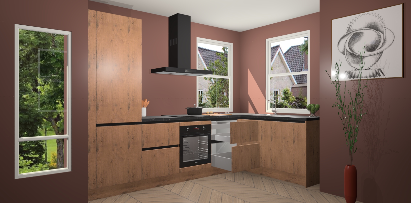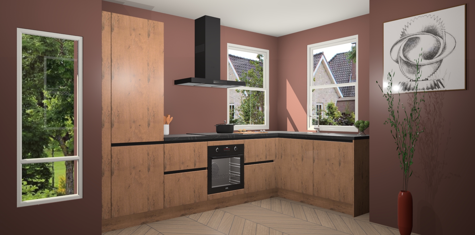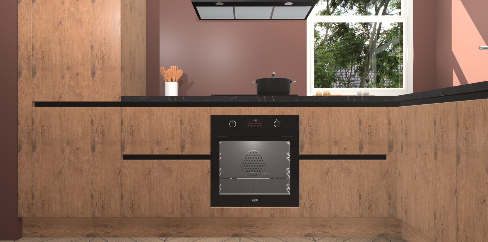 Wat maakt deze keuken zo bijzonder? Ten eerste geeft het houten werkblad uw ruimte een onmiskenbaar klassieke uitstraling. De natuurlijke afwerking roept warmte en elegantie op die nooit uit de mode zullen raken. Bovendien is het gemakkelijk schoon te houden en te onderhouden, zodat je er jarenlang plezier van kunt hebben. Als u op zoek bent naar extra gemak in uw keuken, dan heeft u bij het plaatsen van een bestelling bij ons ook de optie om uw toestellen te upgraden naar AEG-modellen - zo haalt u moderne innovatie van topmerken in apparatentechnologie rechtstreeks in huis.
