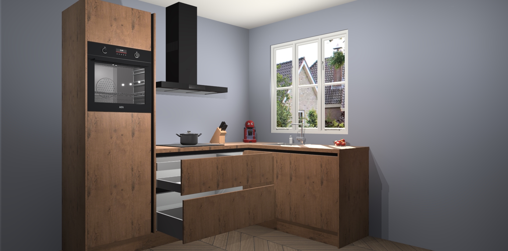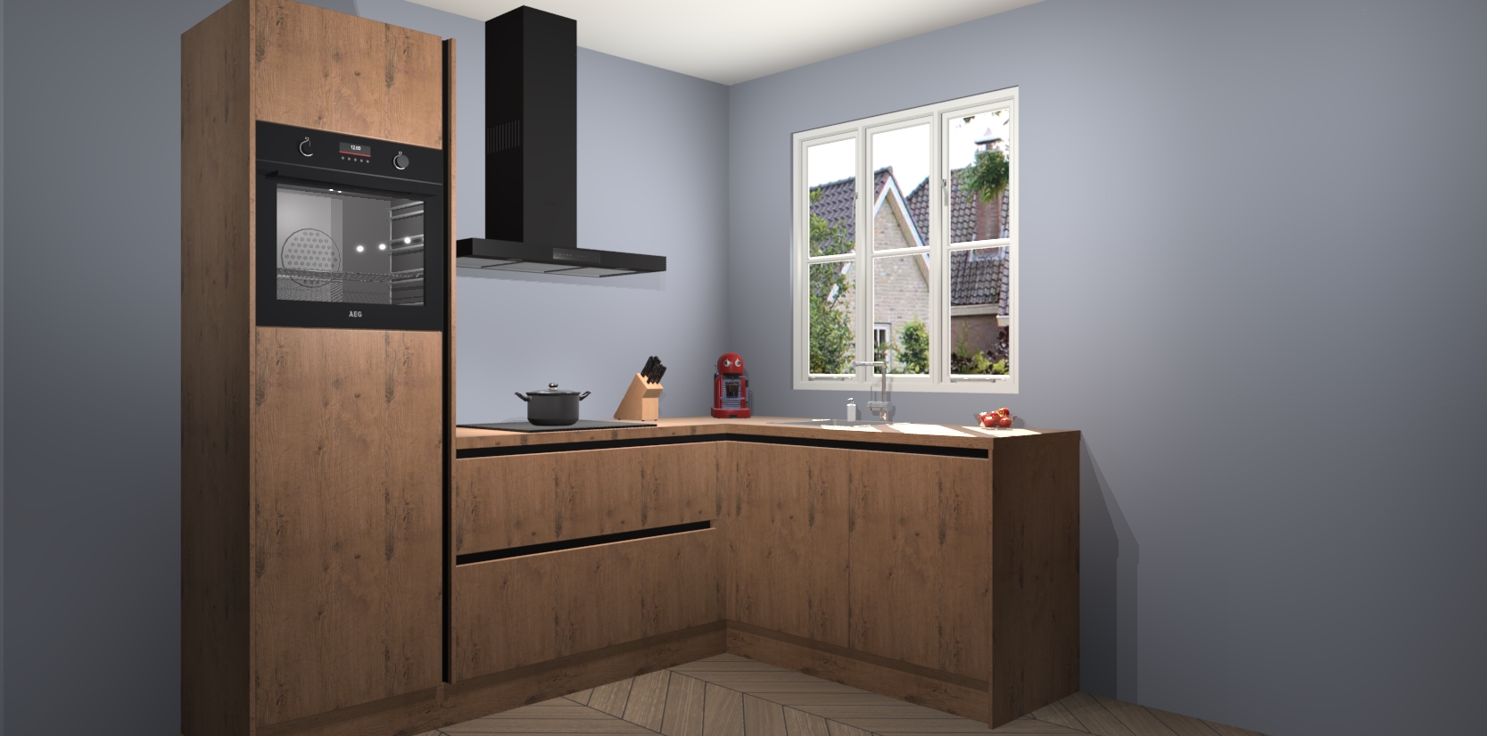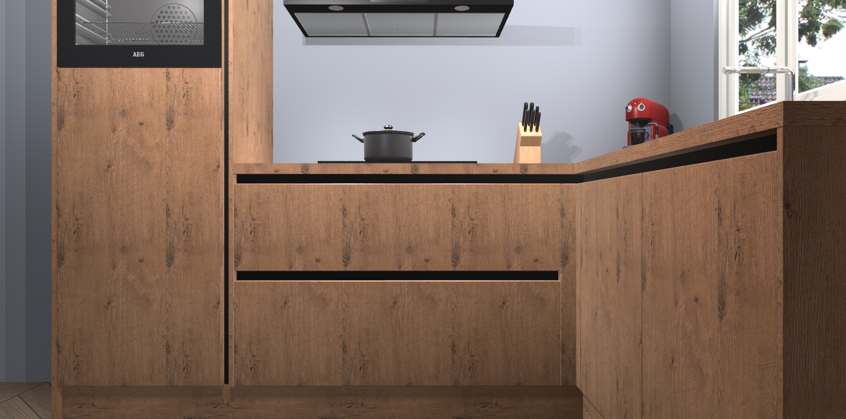 Dit model biedt u voldoende opbergruimte en vijf ingebouwde apparaten: een oven, inductiekookplaat, afzuigkap, vaatwasser en koelkast. Deze apparaten kunnen gemakkelijk worden geüpgrade naar AEG nadat u besteld heeft. De verschillende laden en kastjes bevatten softclose-deuren waardoor ze gezellig dichtvallen met een geruststellend helemaal geruisloos geluid. En dat is nog niet alles! We garanderen ook dat de prijs altijd laag blijft - dus haal nu uw Astoria Eiken greeploze keuken Victoria terwijl het kan.