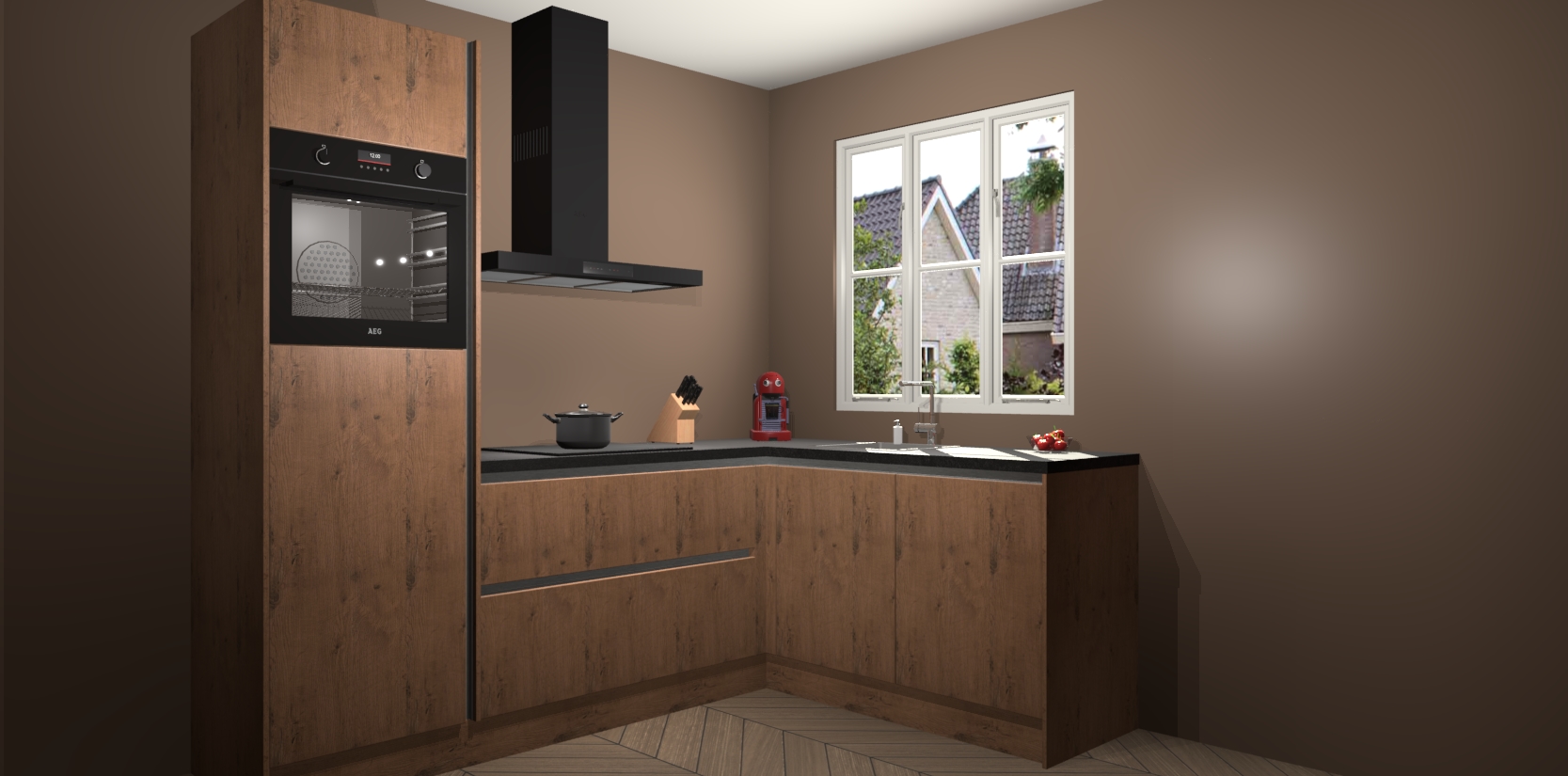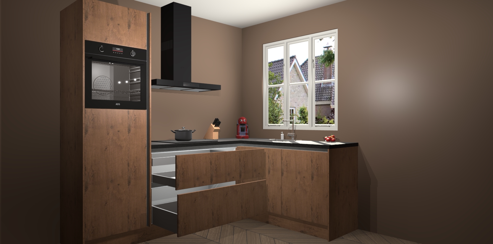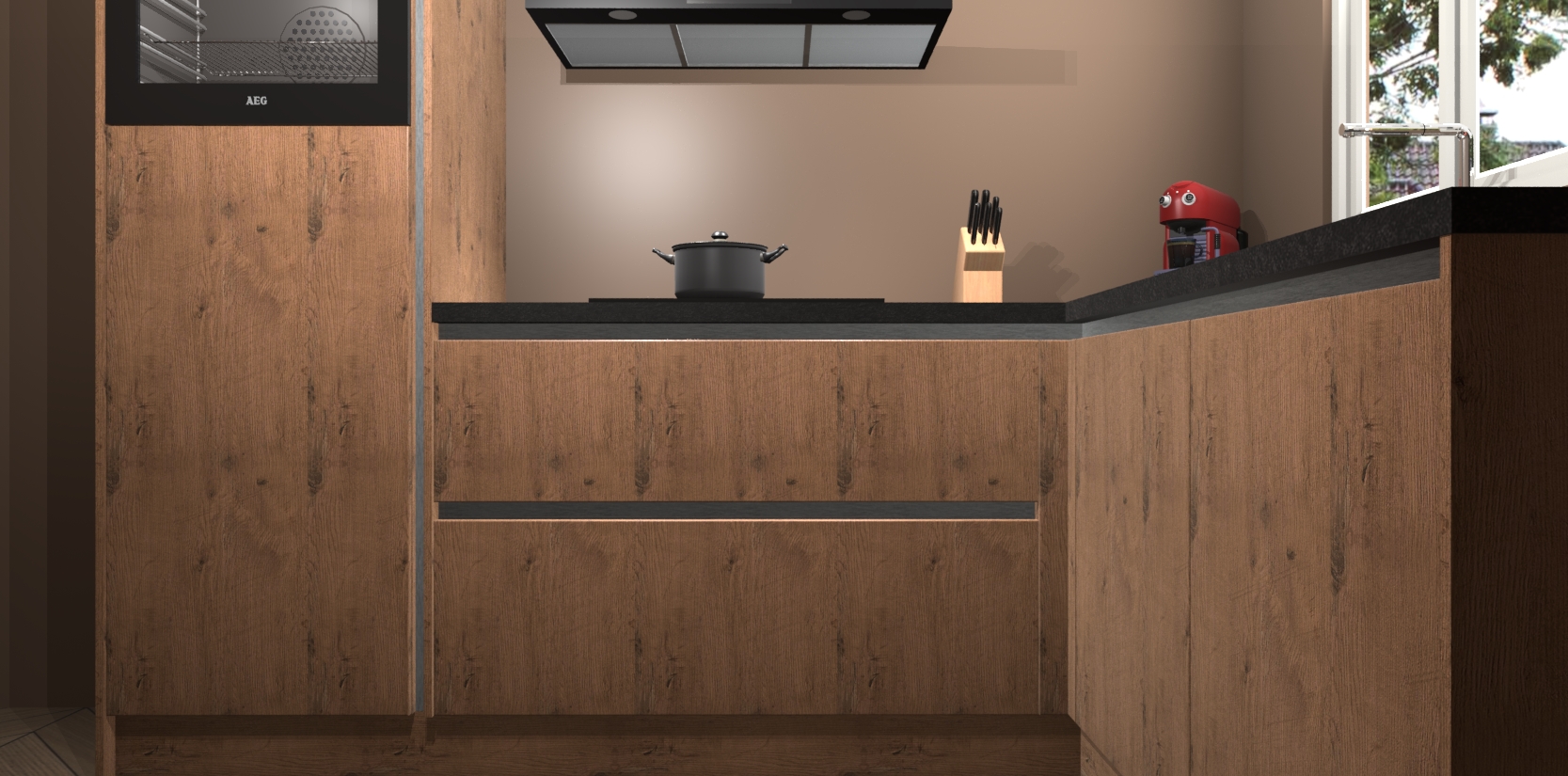 Dit model biedt u voldoende opbergruimte en vijf ingebouwde apparaten: een oven, inductiekookplaat, afzuigkap, vaatwasser en koelkast. Deze apparaten kunnen gemakkelijk worden geüpgrade naar AEG nadat u besteld heeft. De verschillende laden en kastjes bevatten softclose-deuren waardoor ze gezellig dichtvallen met een geruststellend helemaal geruisloos geluid. En dat is nog niet alles! We garanderen ook dat de prijs altijd laag blijft - dus haal nu uw Astoria Eiken greeploze keuken Victoria terwijl het kan.