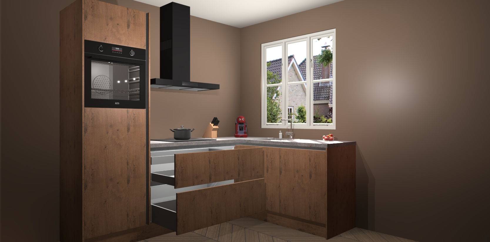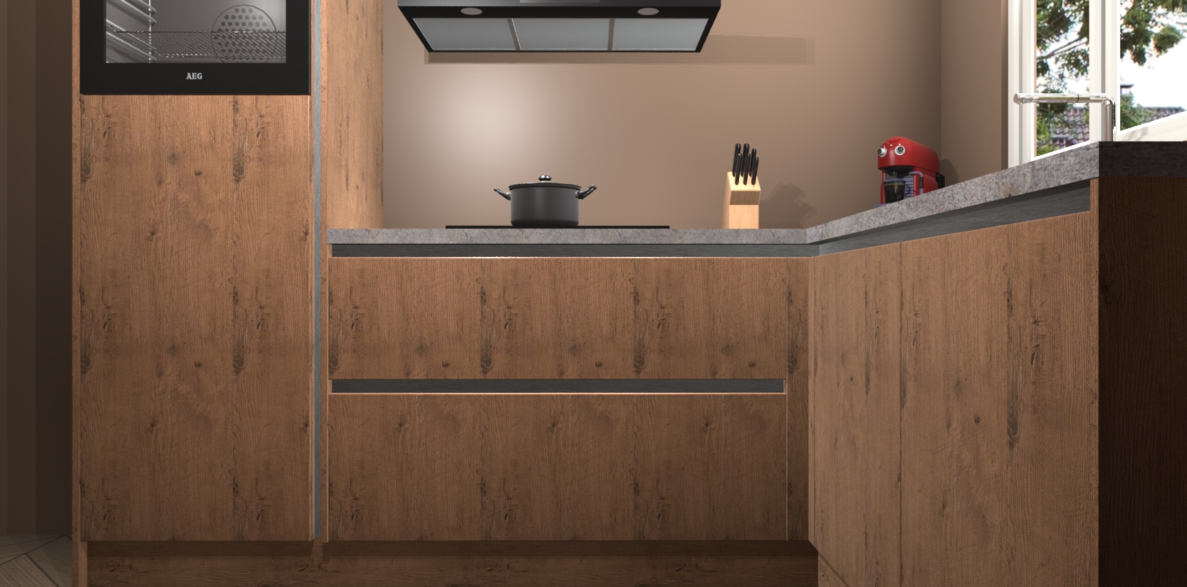 Dit model biedt u voldoende opbergruimte en vijf ingebouwde apparaten: een oven, inductiekookplaat, afzuigkap, vaatwasser en koelkast. Deze apparaten kunnen gemakkelijk worden geüpgrade naar AEG nadat u besteld heeft. De verschillende laden en kastjes bevatten softclose-deuren waardoor ze gezellig dichtvallen met een geruststellend helemaal geruisloos geluid. En dat is nog niet alles! We garanderen ook dat de prijs altijd laag blijft - dus haal nu uw Astoria Eiken greeploze keuken Victoria terwijl het kan.