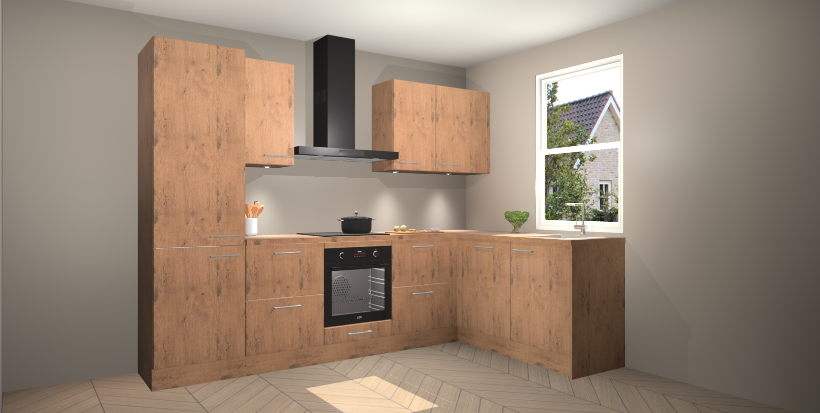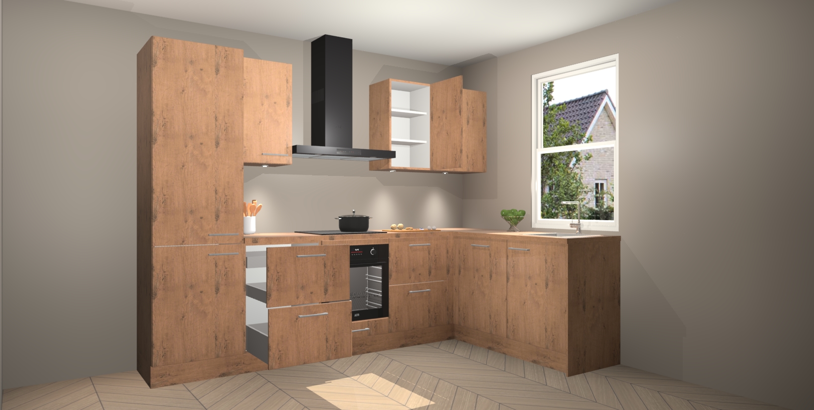 Maak kennis met de trendsettende en luxe Astoria Eiken keuken Bazel! Deze uitzonderlijke keuken van Duitse kwaliteit is stijlvol, modern en perfect om elk huis mee op te fleuren. De binnenkant van de kasten worden meegenomen in een bijpassende kleur om een samenhangende eigentijdse esthetiek te voltooien. U zult dol zijn op hoe uw pas gerenoveerde keuken eruitziet met de Astoria Eiken editie!