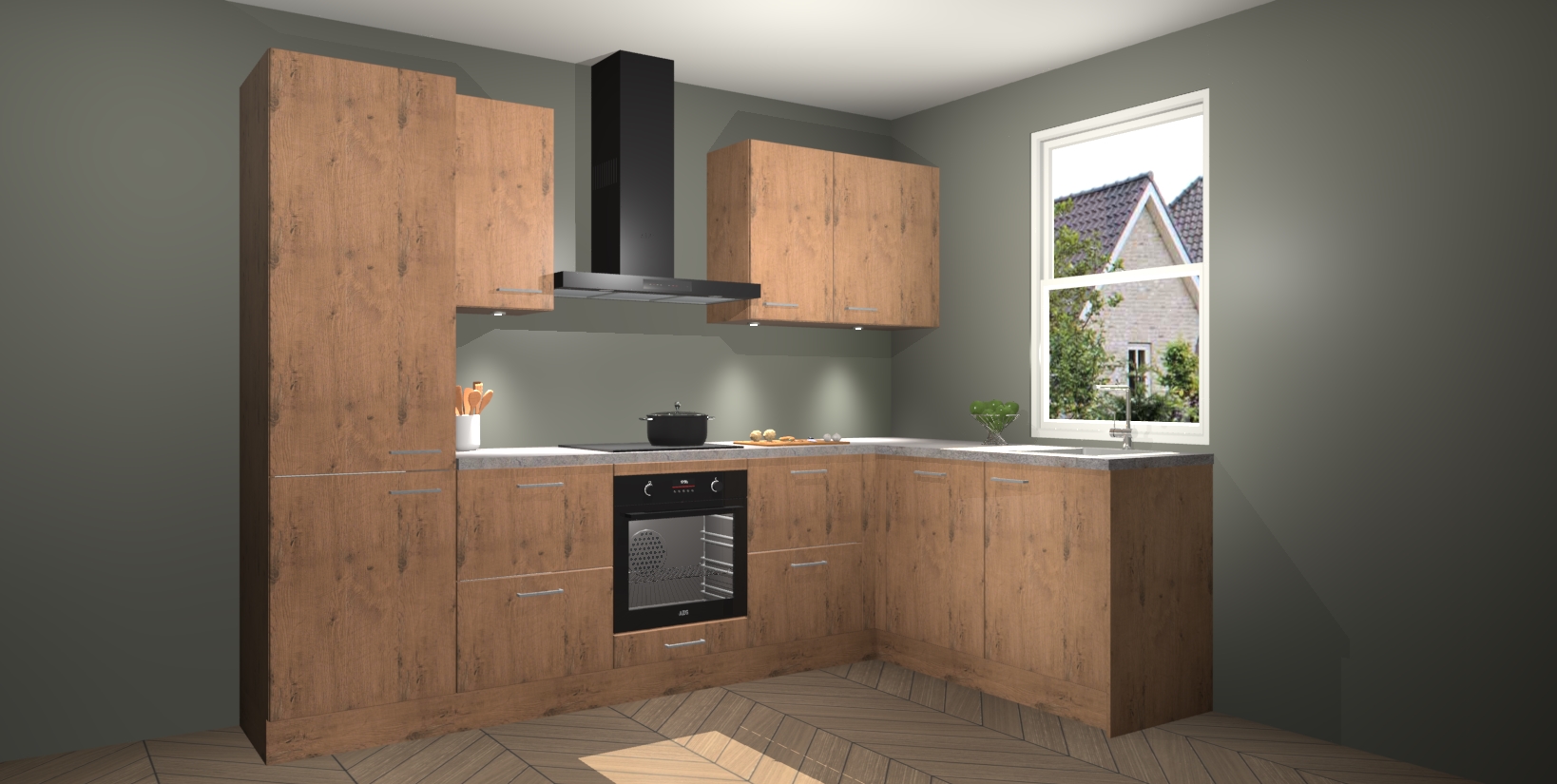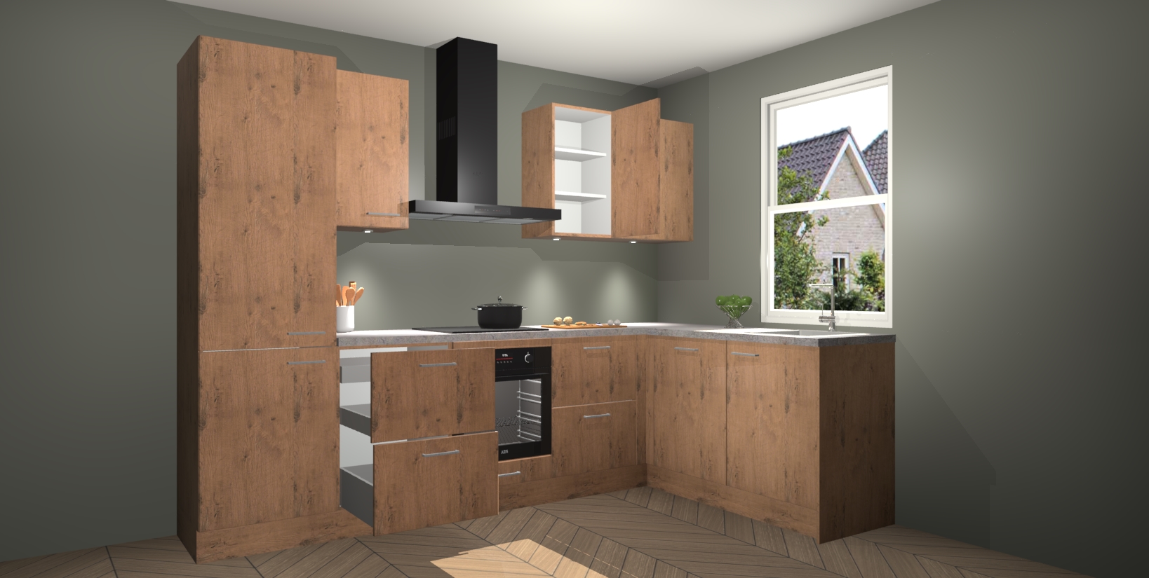 Maak kennis met de trendsettende en luxe Astoria Eiken keuken Bazel! Deze uitzonderlijke keuken van Duitse kwaliteit is stijlvol, modern en perfect om elk huis mee op te fleuren. De binnenkant van de kasten worden meegenomen in een bijpassende kleur om een samenhangende eigentijdse esthetiek te voltooien. U zult dol zijn op hoe uw pas gerenoveerde keuken eruitziet met de Astoria Eiken editie!