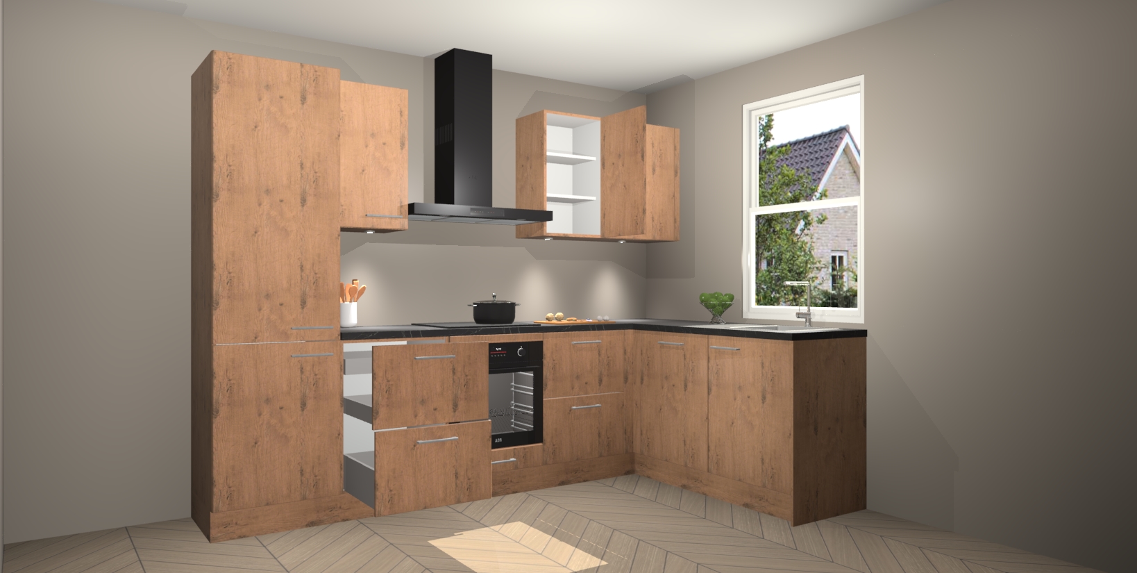 Maak kennis met de trendsettende en luxe Astoria Eiken keuken Bazel! Deze uitzonderlijke keuken van Duitse kwaliteit is stijlvol, modern en perfect om elk huis mee op te fleuren. De binnenkant van de kasten worden meegenomen in een bijpassende kleur om een samenhangende eigentijdse esthetiek te voltooien. U zult dol zijn op hoe uw pas gerenoveerde keuken eruitziet met de Astoria Eiken editie!