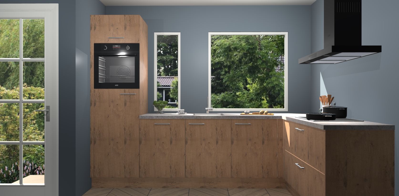 Deze complete keuken wordt geleverd met 5 inbouwapparaten: een oven, inductiekookplaat, afzuigkap, vaatwasser en koelkast.  De toestellen kunnen na bestelling ook gemakkelijk worden opgewaardeerd naar AEG. Bovendien is elke deur in deze keuken voorzien van handige softclose technologie voor eenvoudig gebruik! Als een leuke toevoeging zit in deze keuken ook een carrousel, zo hoef je niet meer de hoek in duiken om iets te pakken.