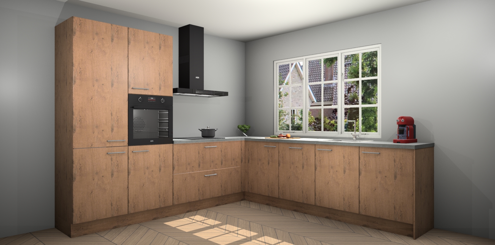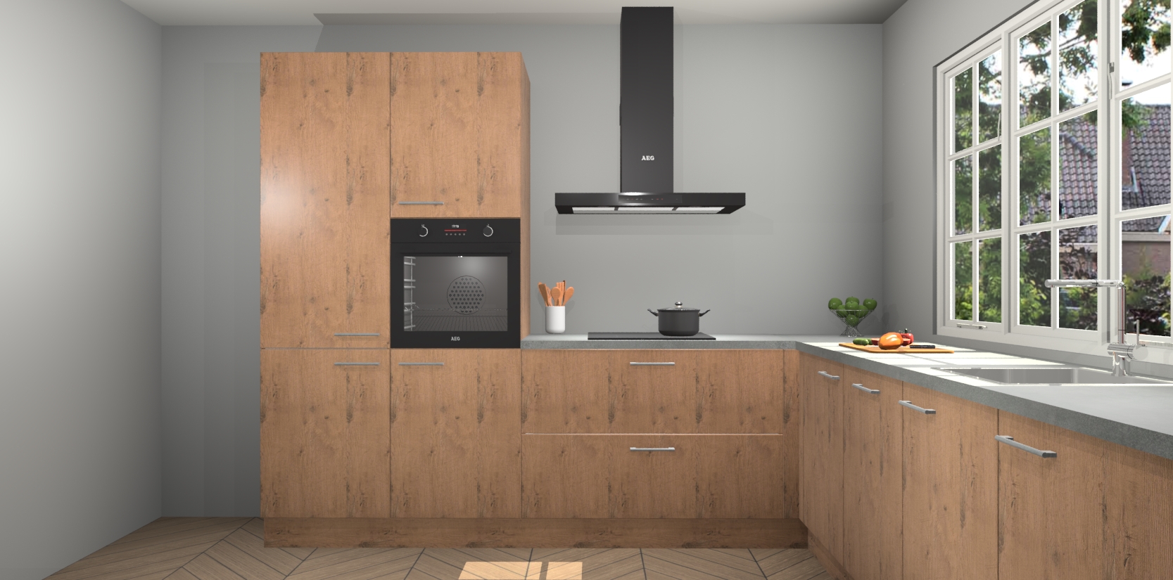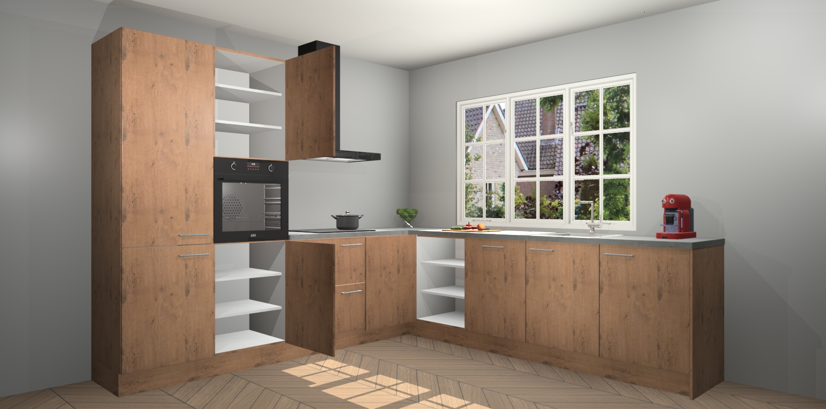 De keuken heeft veel opbergruimte, waardoor u alle ingrediënten gemakkelijk bereikbaar hebt staan. En daarnaast bevat deze volledig uitgeruste keuken ook 5 ingebouwde apparaten: een oven, inductiekookplaat, afzuigkap, vaatwasser en koelkast. Deze zijn heel eenvoudig na bestellen te upgraden naar AEG als u dit wilt. Bovendien zijn de softclose-kastdeuren ideaal; geef ze gewoon even een tikje en ze sluiten automatisch met geruisloze precisie.