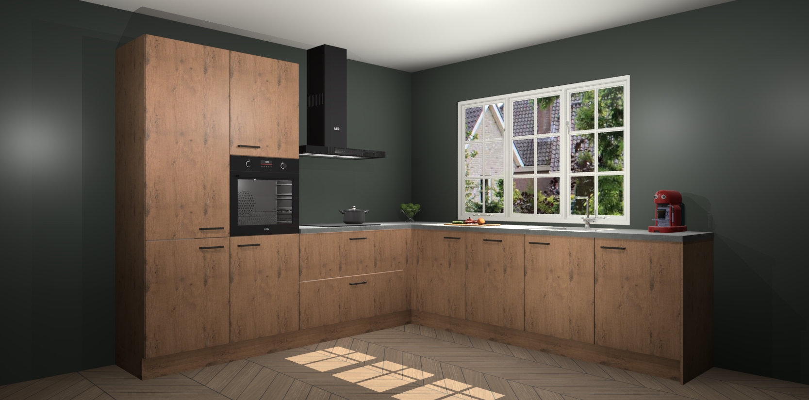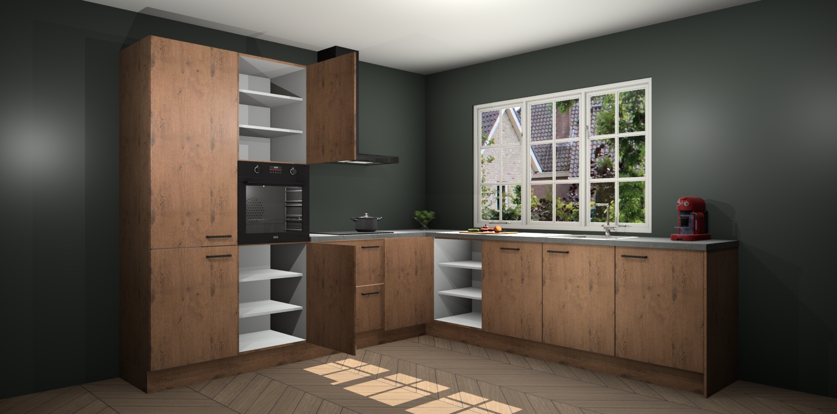 De keuken heeft veel opbergruimte, waardoor u alle ingrediënten gemakkelijk bereikbaar hebt staan. En daarnaast bevat deze volledig uitgeruste keuken ook 5 ingebouwde apparaten: een oven, inductiekookplaat, afzuigkap, vaatwasser en koelkast. Deze zijn heel eenvoudig na bestellen te upgraden naar AEG als u dit wilt. Bovendien zijn de softclose-kastdeuren ideaal; geef ze gewoon even een tikje en ze sluiten automatisch met geruisloze precisie.