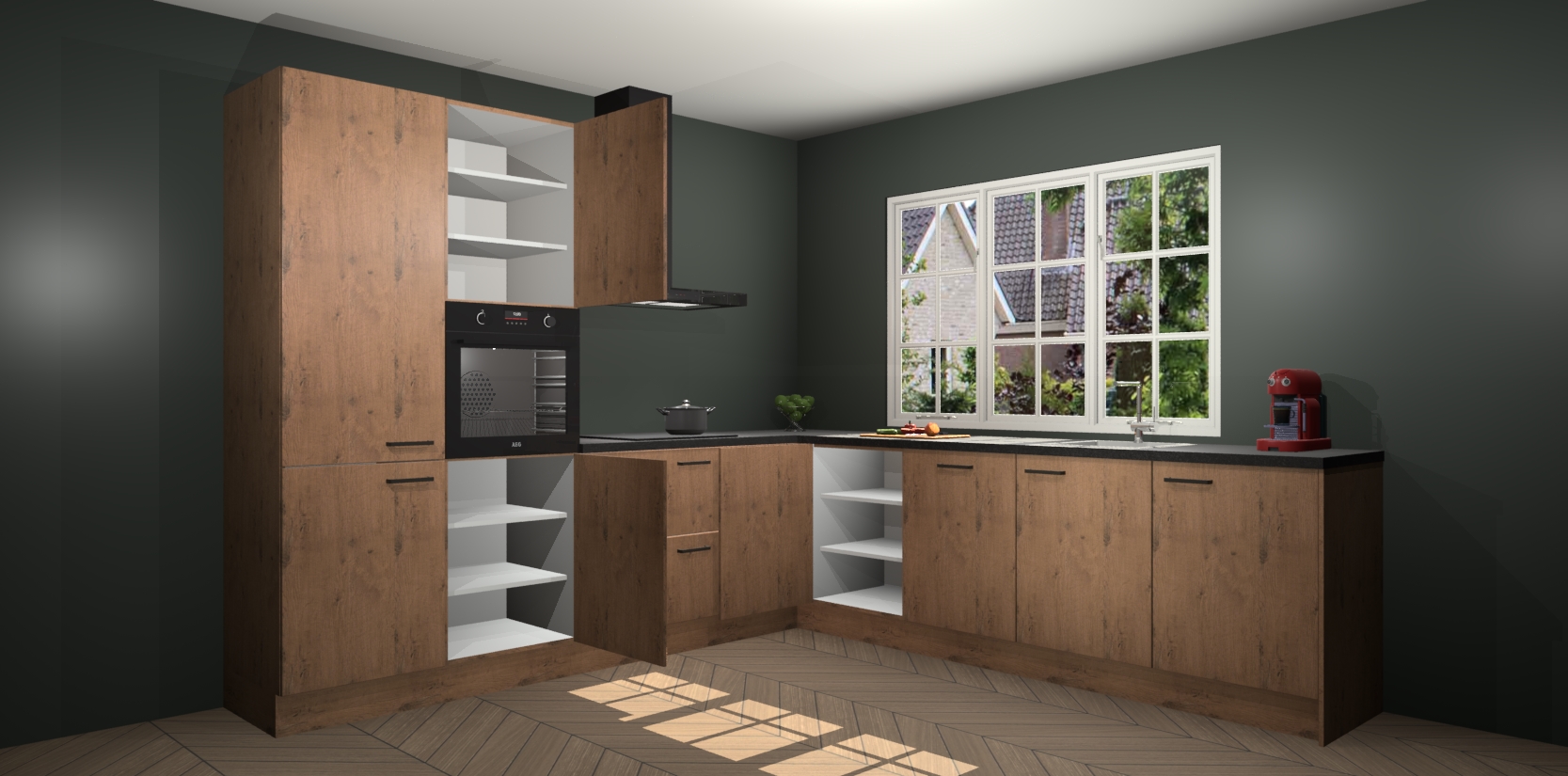 De keuken heeft veel opbergruimte, waardoor u alle ingrediënten gemakkelijk bereikbaar hebt staan. En daarnaast bevat deze volledig uitgeruste keuken ook 5 ingebouwde apparaten: een oven, inductiekookplaat, afzuigkap, vaatwasser en koelkast. Deze zijn heel eenvoudig na bestellen te upgraden naar AEG als u dit wilt. Bovendien zijn de softclose-kastdeuren ideaal; geef ze gewoon even een tikje en ze sluiten automatisch met geruisloze precisie.
