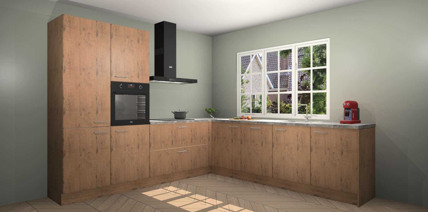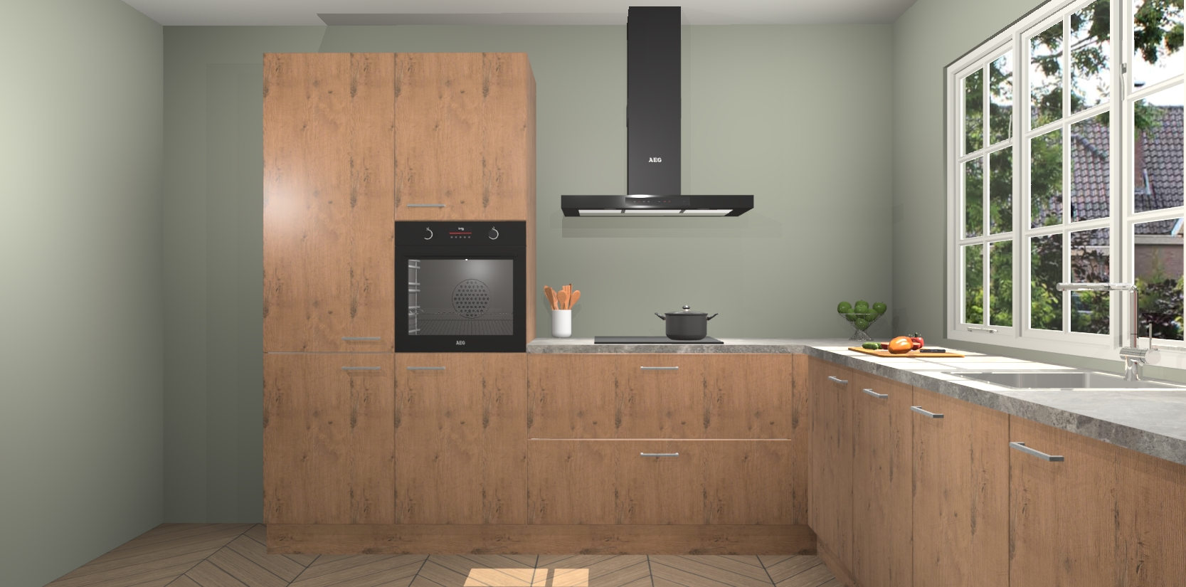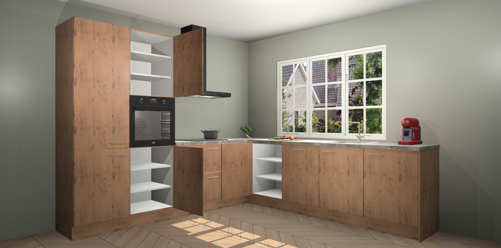 De keuken heeft veel opbergruimte, waardoor u alle ingrediënten gemakkelijk bereikbaar hebt staan. En daarnaast bevat deze volledig uitgeruste keuken ook 5 ingebouwde apparaten: een oven, inductiekookplaat, afzuigkap, vaatwasser en koelkast. Deze zijn heel eenvoudig na bestellen te upgraden naar AEG als u dit wilt. Bovendien zijn de softclose-kastdeuren ideaal; geef ze gewoon even een tikje en ze sluiten automatisch met geruisloze precisie.