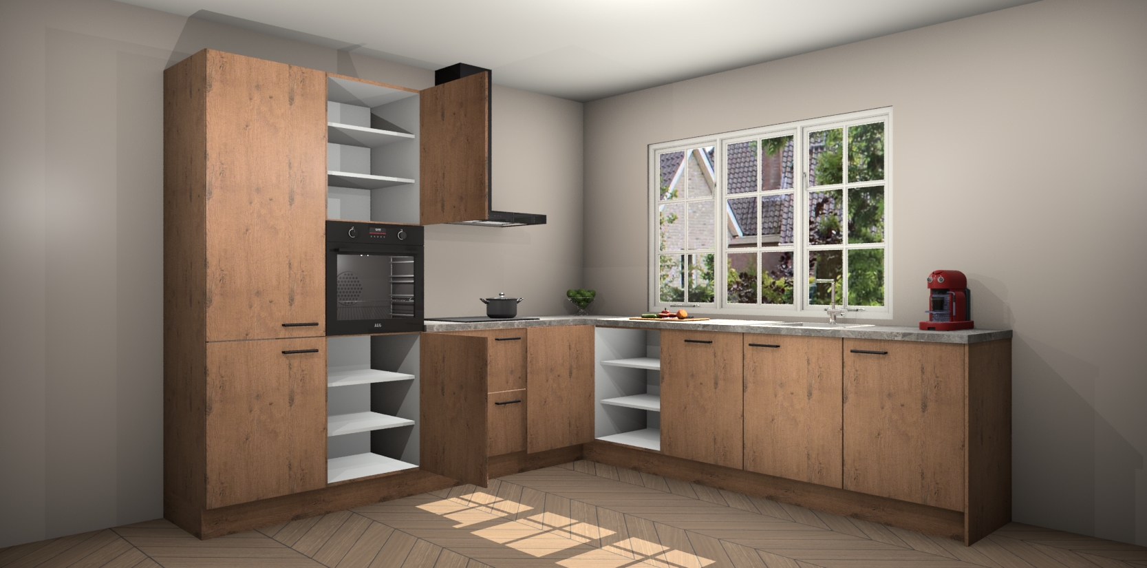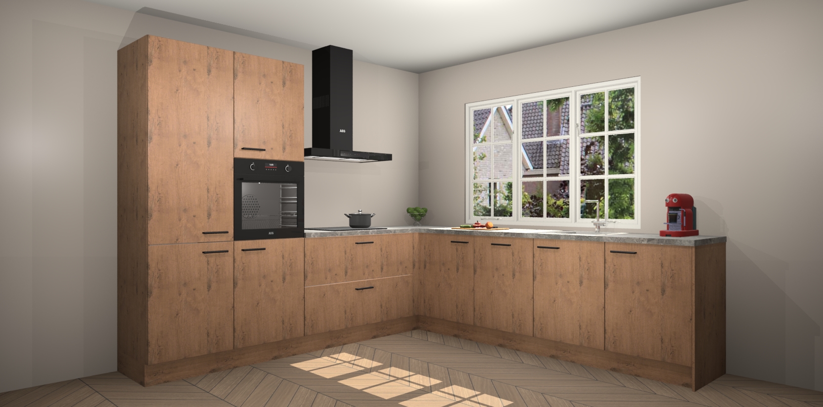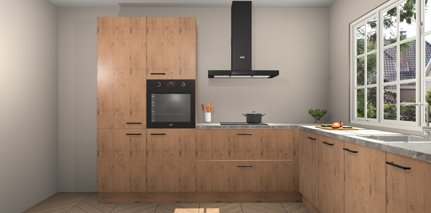 De keuken heeft veel opbergruimte, waardoor u alle ingrediënten gemakkelijk bereikbaar hebt staan. En daarnaast bevat deze volledig uitgeruste keuken ook 5 ingebouwde apparaten: een oven, inductiekookplaat, afzuigkap, vaatwasser en koelkast. Deze zijn heel eenvoudig na bestellen te upgraden naar AEG als u dit wilt. Bovendien zijn de softclose-kastdeuren ideaal; geef ze gewoon even een tikje en ze sluiten automatisch met geruisloze precisie.