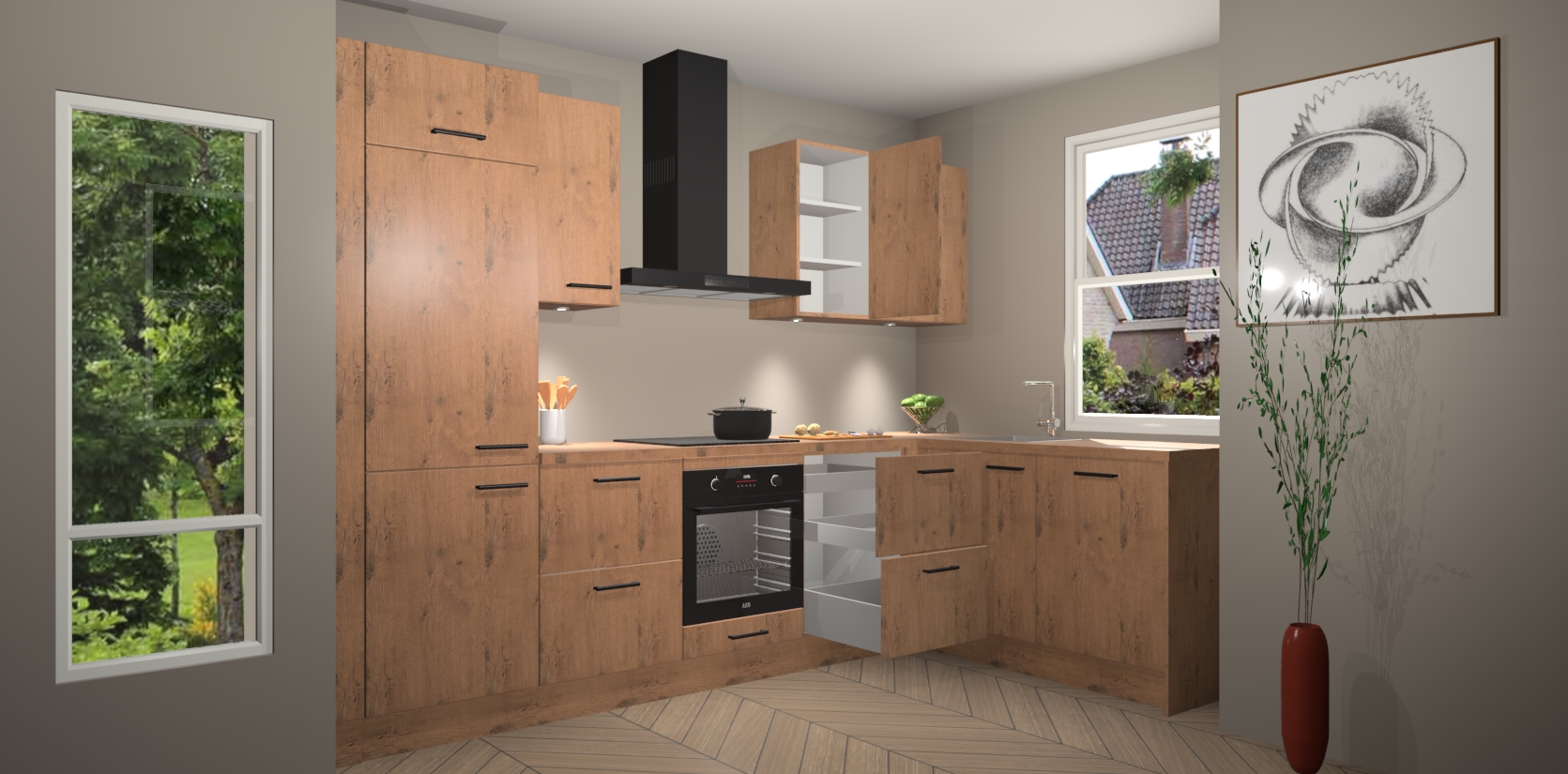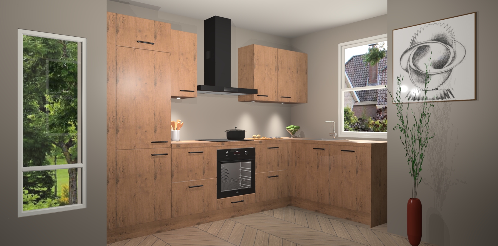 Bent u op zoek naar een moderne en tijdloze keuken die schoonheid in uw huis brengt? Zoek dan niet verder dan de Astoria Eiken keuken Geneve - de perfecte keuken voor al uw wensen. Deze hoekkeuken biedt de hoogste Duitse kwaliteit voor een vaste lage prijs en is zeker een blikvanger in uw huis!