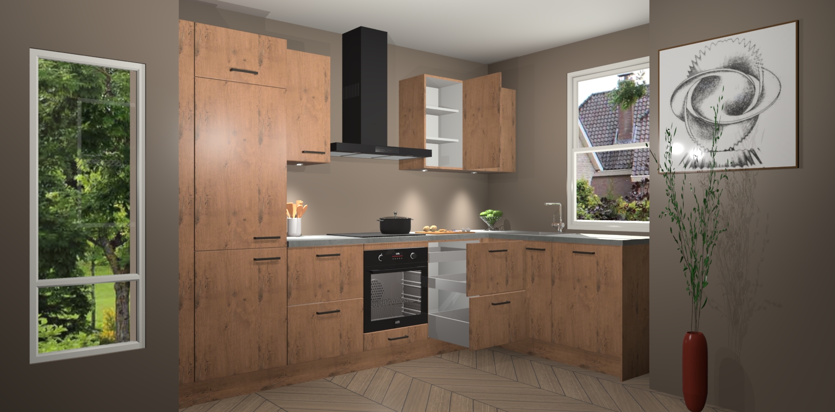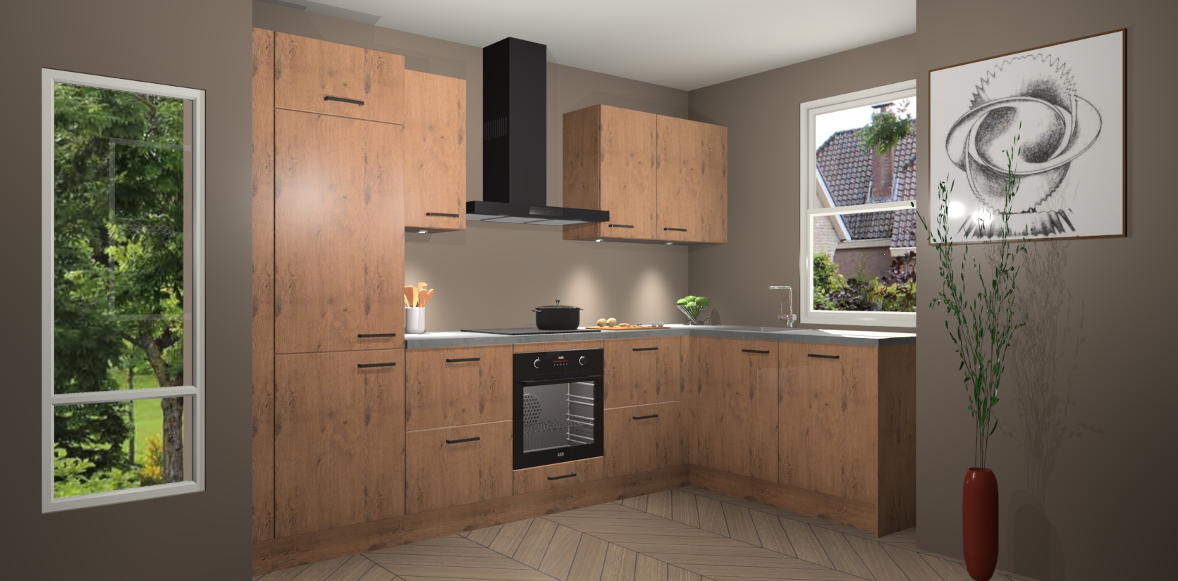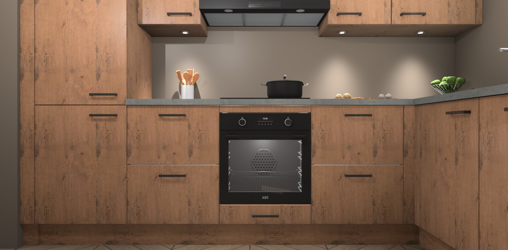 De Astoria Eiken keuken Geneve is uitgerust met 5 inbouwapparaten - een oven, inductiekookplaat, afzuigkap, vaatwasser en koelkast - voor al uw kook- en bewaarbehoeftes. U kunt deze apparaten desgewenst eenvoudig upgraden naar AEG of de oven omruilen voor een combimagnetron na het plaatsen van uw bestelling. En met de soft close deuren, voldoende opbergruimte en kasten die voorgemonteerd worden geleverd, bent u in een mum van tijd klaar om heerlijke maaltijden te bereiden!