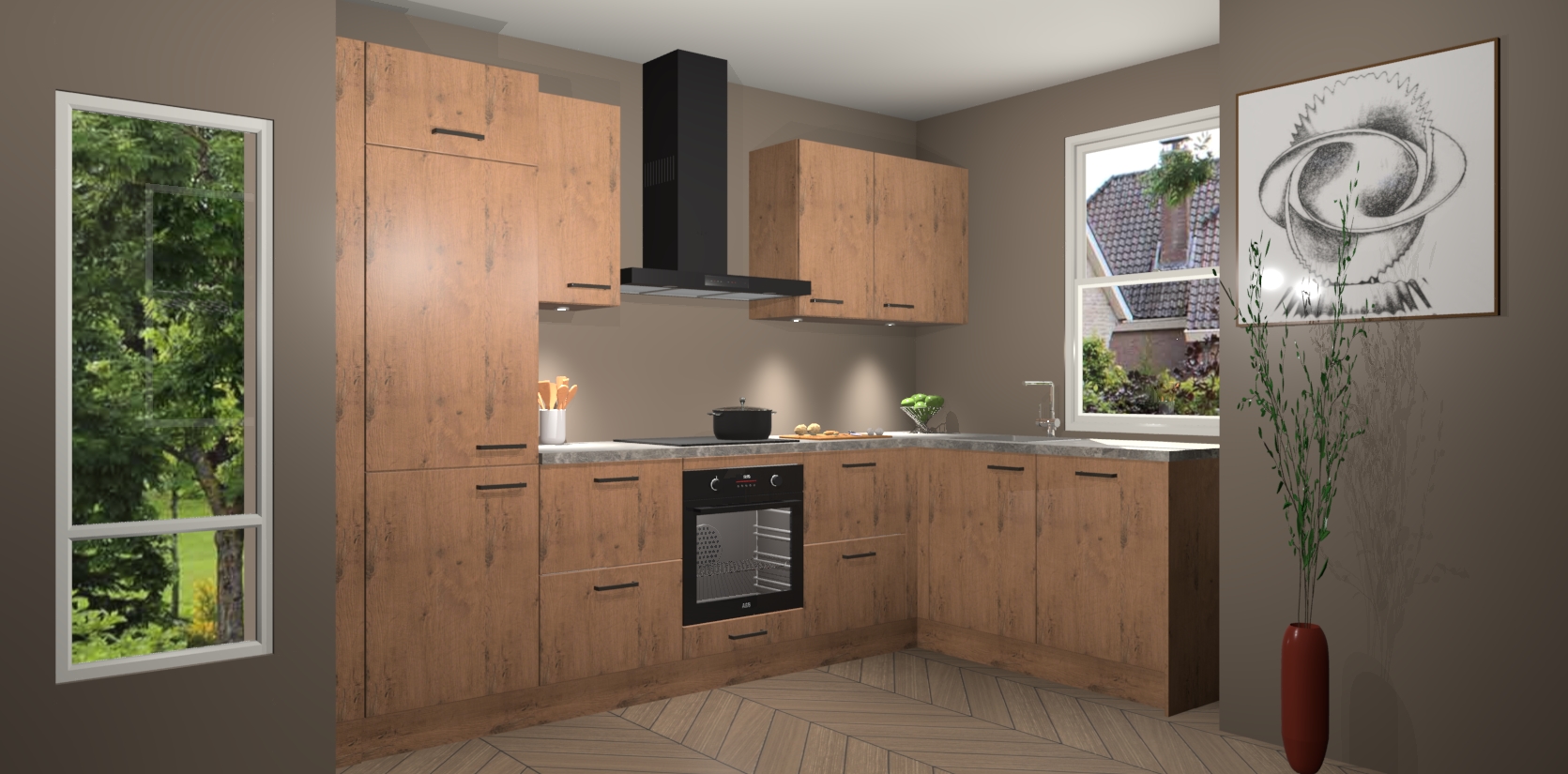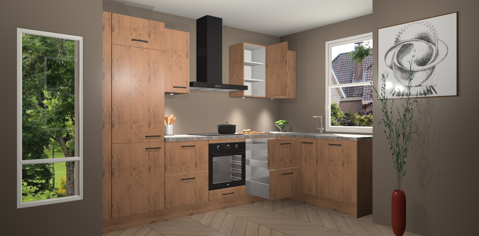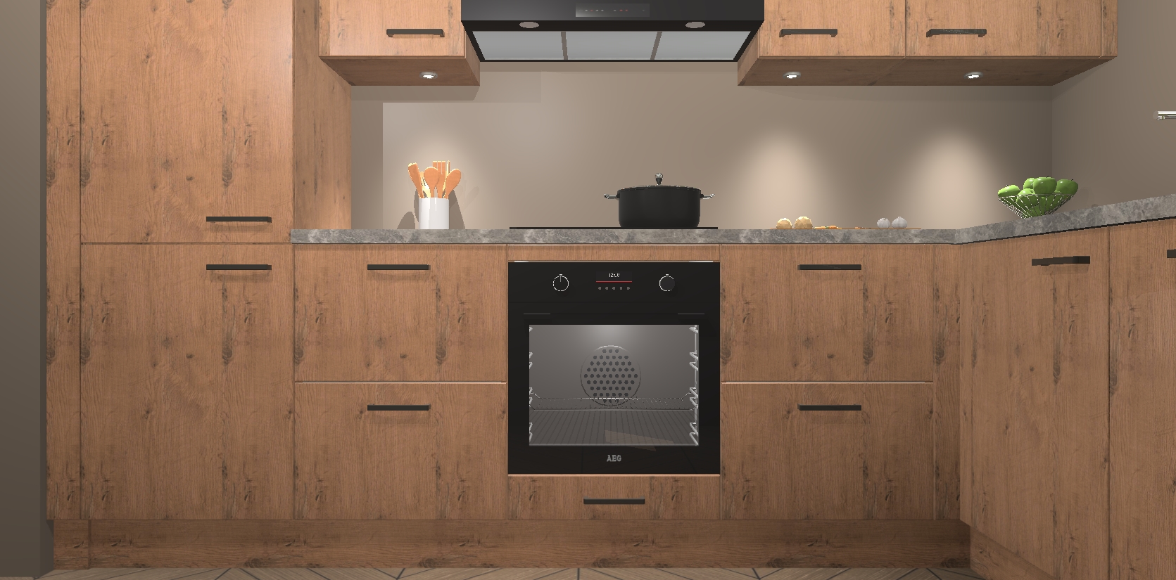 De Astoria Eiken keuken Geneve is uitgerust met 5 inbouwapparaten - een oven, inductiekookplaat, afzuigkap, vaatwasser en koelkast - voor al uw kook- en bewaarbehoeftes. U kunt deze apparaten desgewenst eenvoudig upgraden naar AEG of de oven omruilen voor een combimagnetron na het plaatsen van uw bestelling. En met de soft close deuren, voldoende opbergruimte en kasten die voorgemonteerd worden geleverd, bent u in een mum van tijd klaar om heerlijke maaltijden te bereiden!