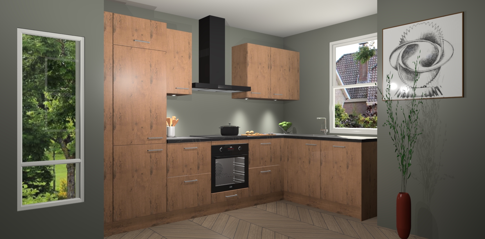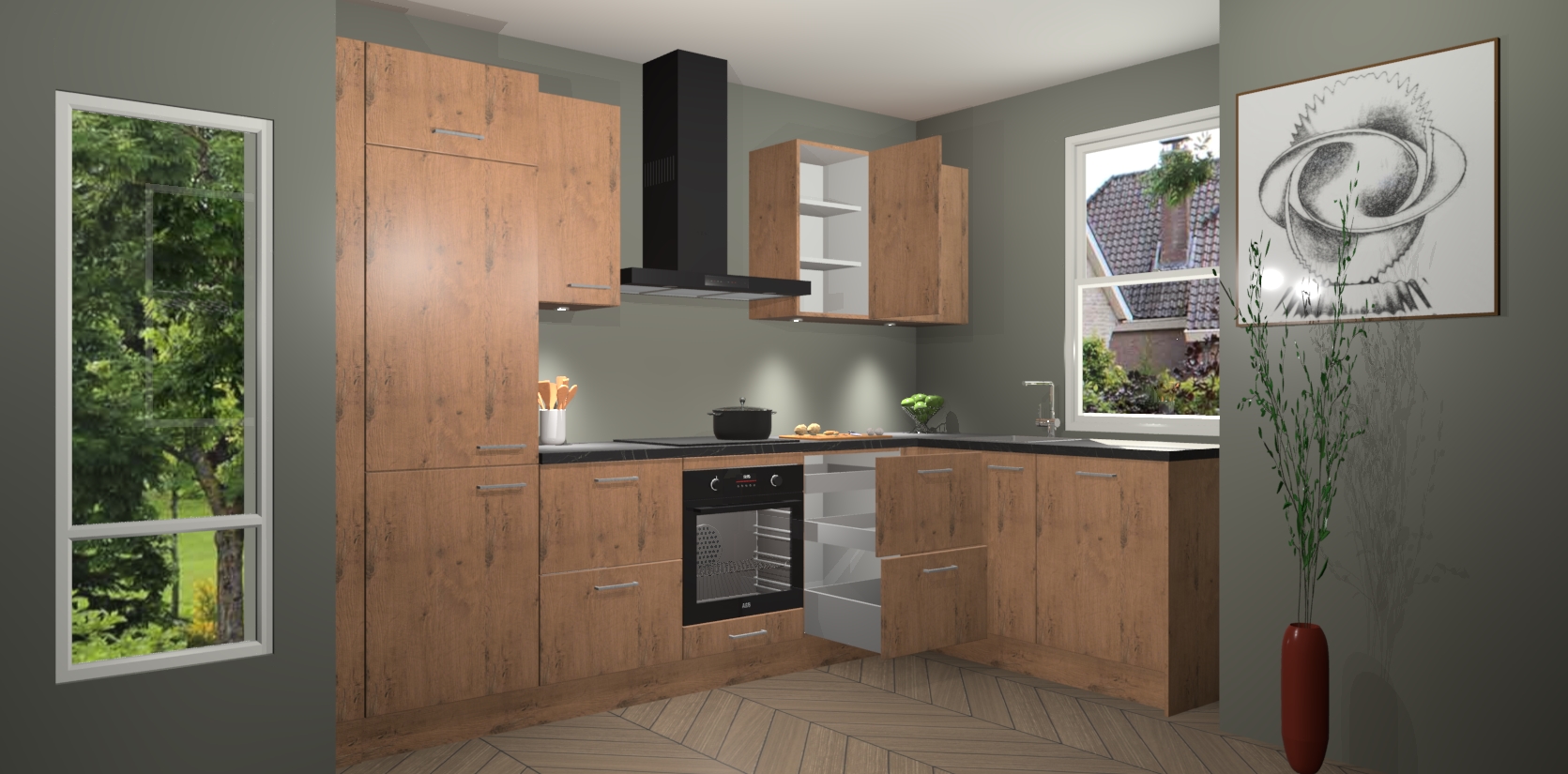 De Astoria Eiken keuken Geneve is uitgerust met 5 inbouwapparaten - een oven, inductiekookplaat, afzuigkap, vaatwasser en koelkast - voor al uw kook- en bewaarbehoeftes. U kunt deze apparaten desgewenst eenvoudig upgraden naar AEG of de oven omruilen voor een combimagnetron na het plaatsen van uw bestelling. En met de soft close deuren, voldoende opbergruimte en kasten die voorgemonteerd worden geleverd, bent u in een mum van tijd klaar om heerlijke maaltijden te bereiden!