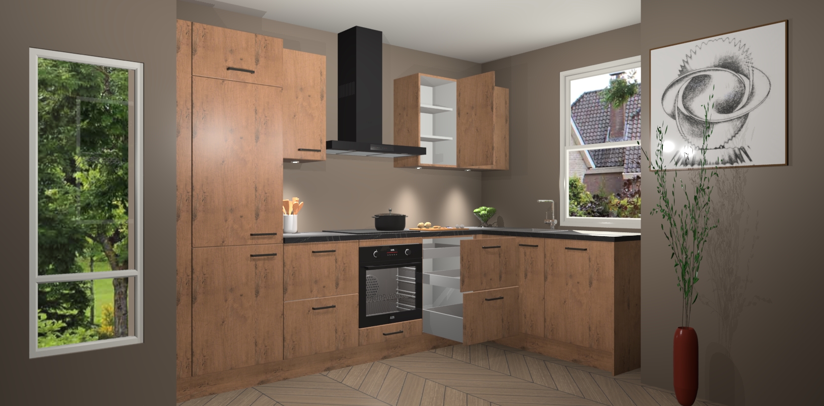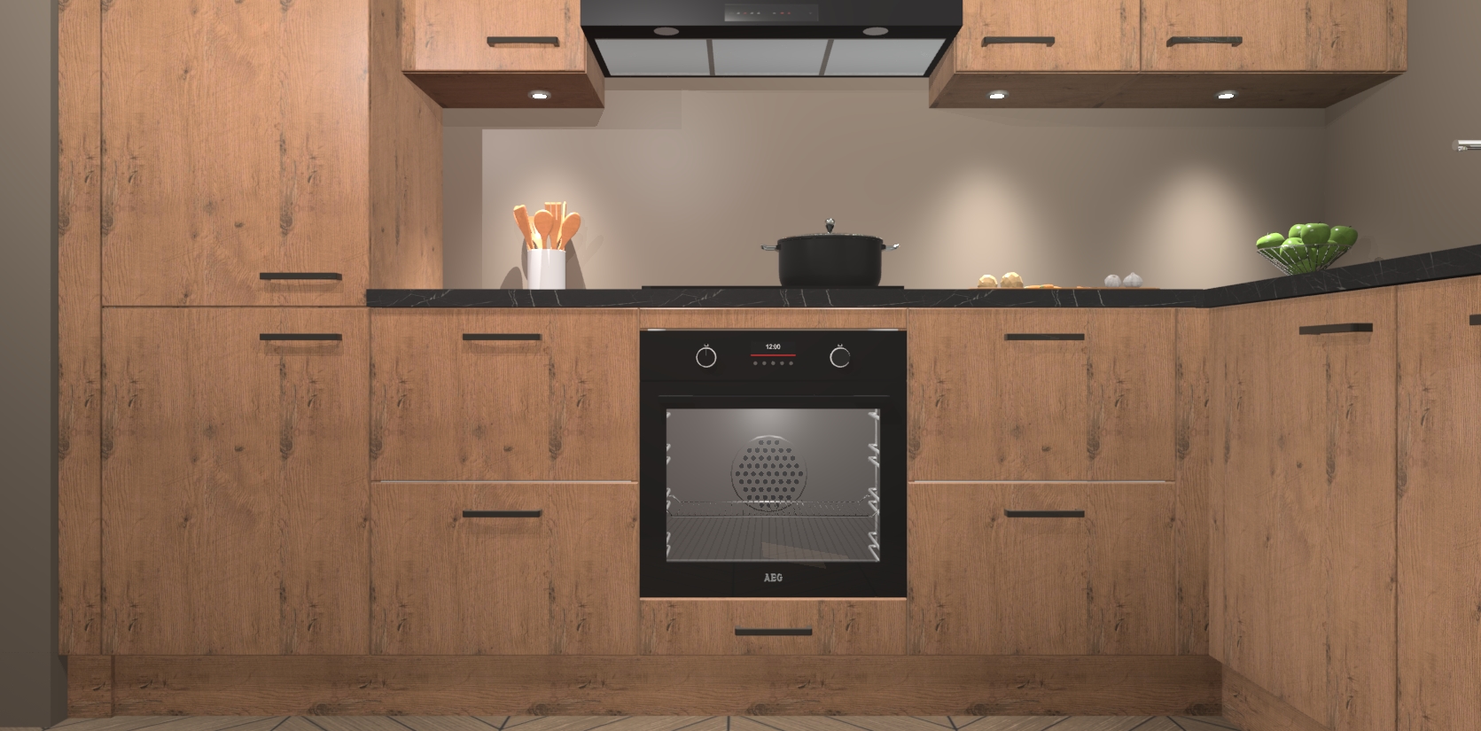 De Astoria Eiken keuken Geneve is uitgerust met 5 inbouwapparaten - een oven, inductiekookplaat, afzuigkap, vaatwasser en koelkast - voor al uw kook- en bewaarbehoeftes. U kunt deze apparaten desgewenst eenvoudig upgraden naar AEG of de oven omruilen voor een combimagnetron na het plaatsen van uw bestelling. En met de soft close deuren, voldoende opbergruimte en kasten die voorgemonteerd worden geleverd, bent u in een mum van tijd klaar om heerlijke maaltijden te bereiden!