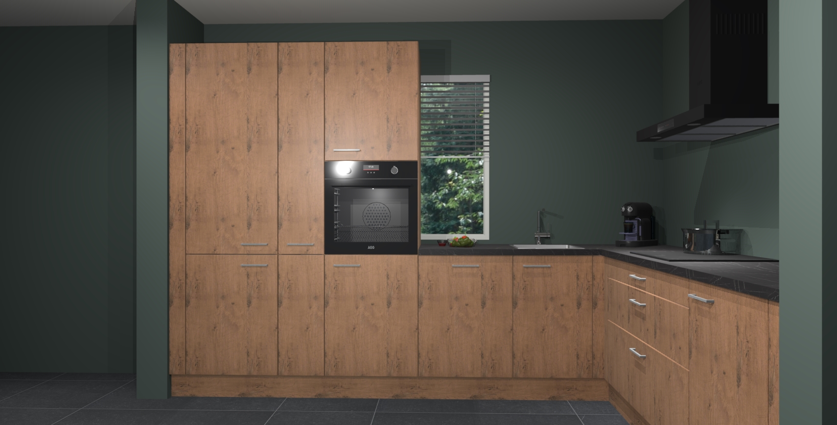 Met een modern, tijdloos design en ruime opslagruimte, zult u zich in no-time thuis voelen in uw nieuwe keuken. Uw leven wordt eenvoudiger met de soft-close deuren die voor het ultieme stille comfort zorgen - geen geluid dat u stoort terwijl u kookt. Ook is de keuken voorzien van 5 ingebouwde apparaten: een oven, inductie kookplaat, afzuigkap, vaatwasser en koelkast. Deze kunnen gemakkelijk na bestelling worden bijgewerkt naar AEG - waardoor uw luxe ervaring compleet is.