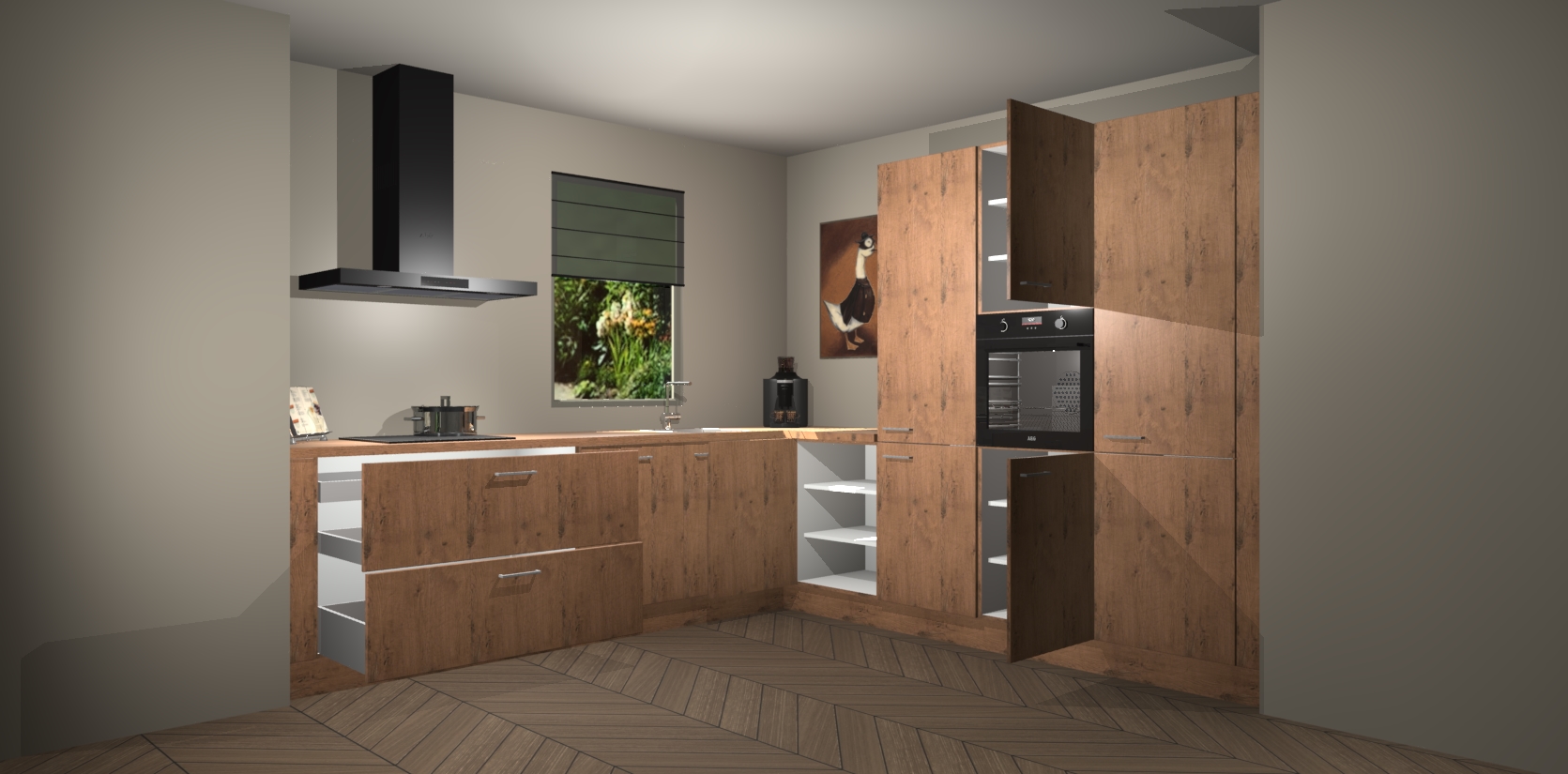 Welkom bij de Astoria Eiken keuken Laos. Deze prachtige keuken zal de komende jaren het middelpunt van de belangstelling in uw huis zijn. Uitgerust met vijf inbouwapparaten komt u nooit kookgereedschap tekort. Bovendien geeft de warme houtlook elke ruimte een uitnodigende en tijdloze uitstraling.
