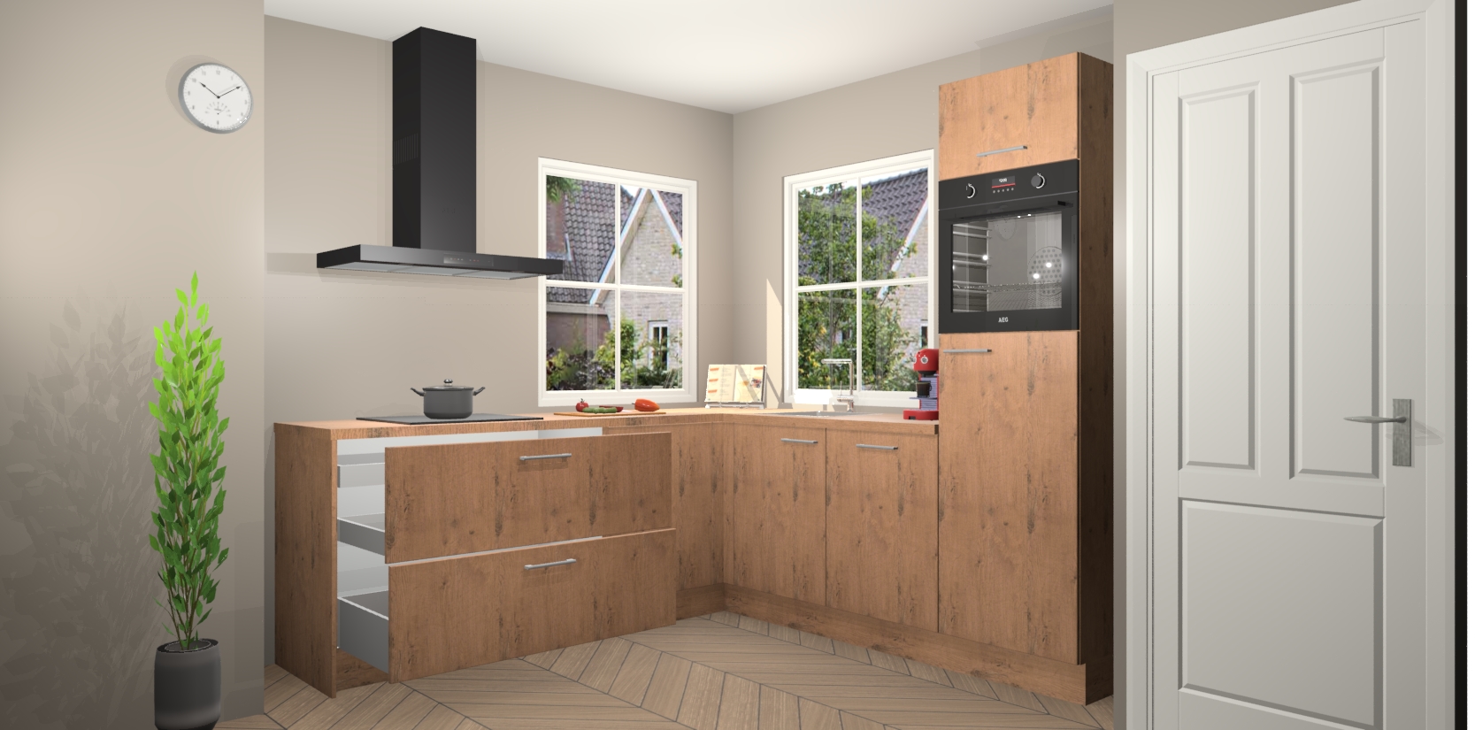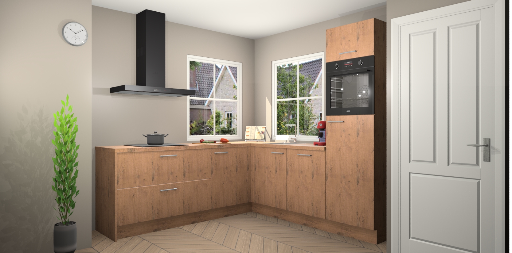 De Astoria Eiken keuken Pai bevat vijf essentiële inbouwapparaten - een oven, inductiekookplaat, afzuigkap, vaatwasser en koelkast - zodat u er na levering meteen in kunt. Voor de slimme kopers die weten dat apparaten vaak het verschil kunnen maken tussen functioneel en luxueus, bieden we eenvoudige upgradeopties naar AEG, van oven naar combimagnetron na bestelling of naar een kookplaat met geïntrigeerde afzuiging. En met onze vaste lage prijs en snelle levering binnen zeven weken vanaf de orderbevestiging hoeft u zich geen zorgen te maken over verborgen kosten of lange levertijden die uw droomkeuken kunnen vertragen.