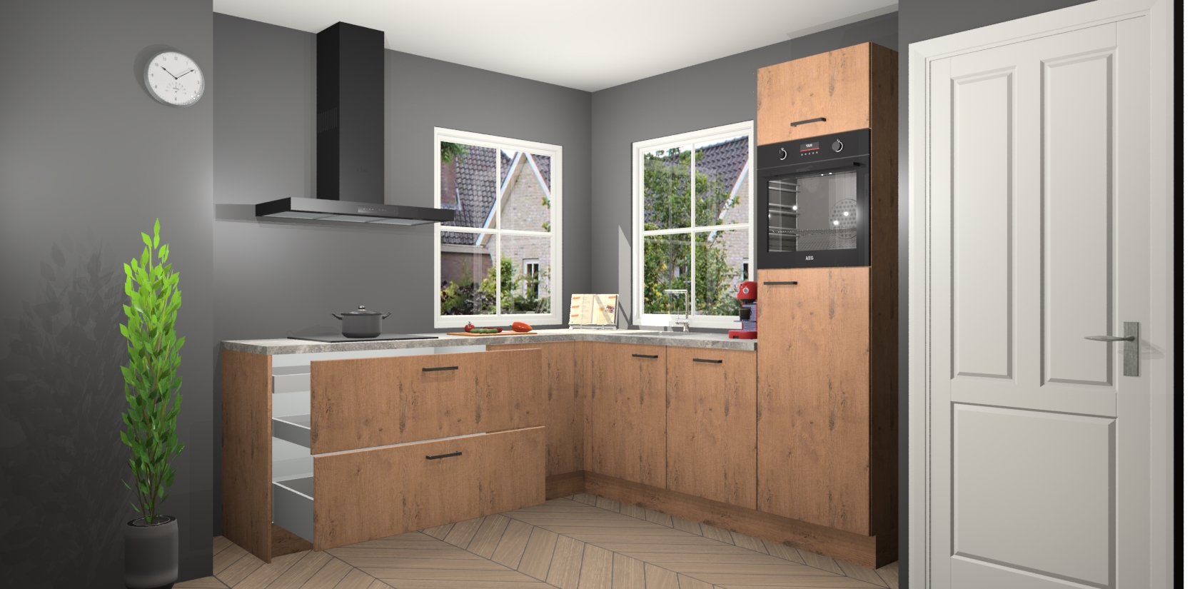 De Astoria Eiken keuken Pai bevat vijf essentiële inbouwapparaten - een oven, inductiekookplaat, afzuigkap, vaatwasser en koelkast - zodat u er na levering meteen in kunt. Voor de slimme kopers die weten dat apparaten vaak het verschil kunnen maken tussen functioneel en luxueus, bieden we eenvoudige upgradeopties naar AEG, van oven naar combimagnetron na bestelling of naar een kookplaat met geïntrigeerde afzuiging. En met onze vaste lage prijs en snelle levering binnen zeven weken vanaf de orderbevestiging hoeft u zich geen zorgen te maken over verborgen kosten of lange levertijden die uw droomkeuken kunnen vertragen.