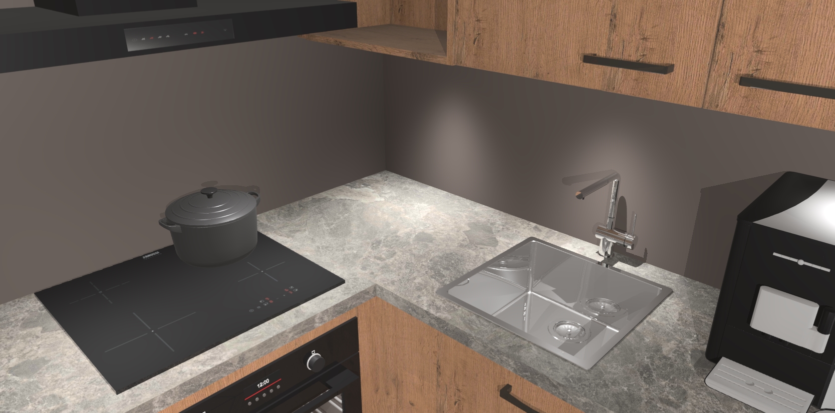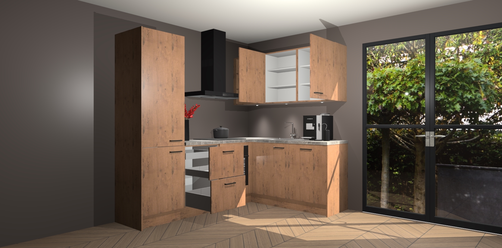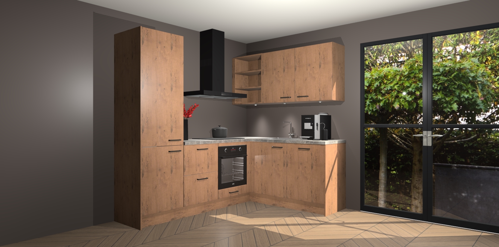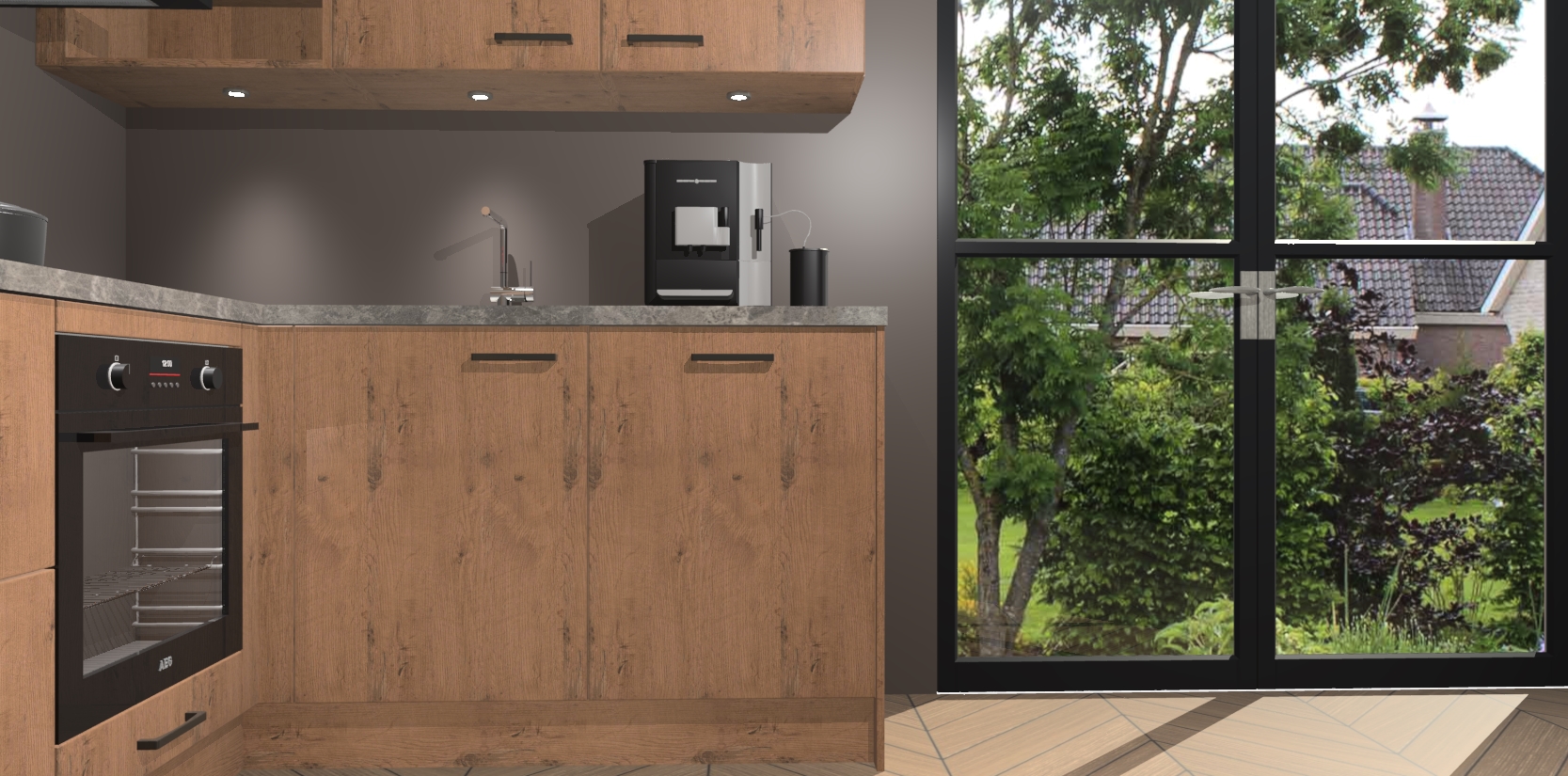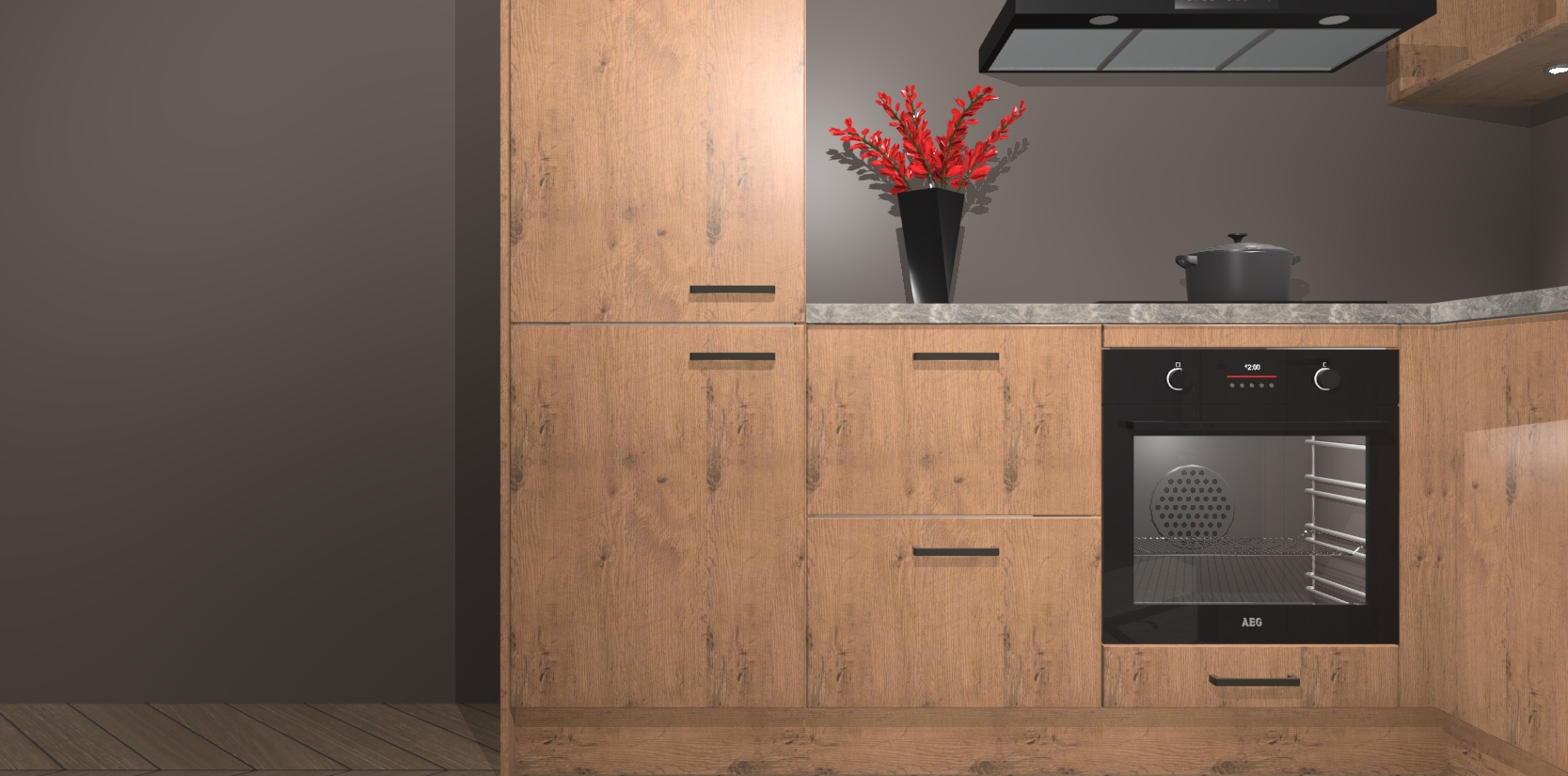 Wauw, dit is de Astoria Eiken keuken Pilsen! U kunt gerust zeggen dat u elegantie combineert met functionaliteit met deze keuken. Met een modern en chique ontwerp is de keuken precies wat u nodig heeft om uw ruimte te verfraaien. De binnenzijde van de kasten is in dezelfde donkere kleur als de buitenzijde voor een uniforme look, compleet met softclose-kasten die stil sluiten.